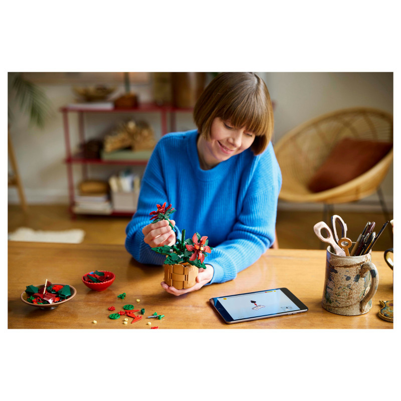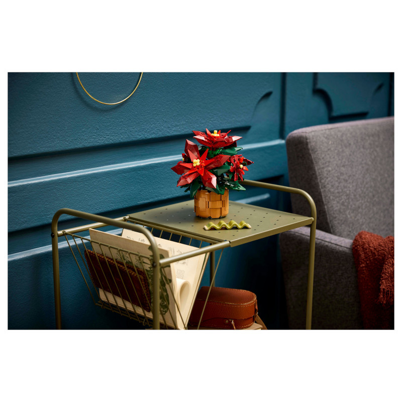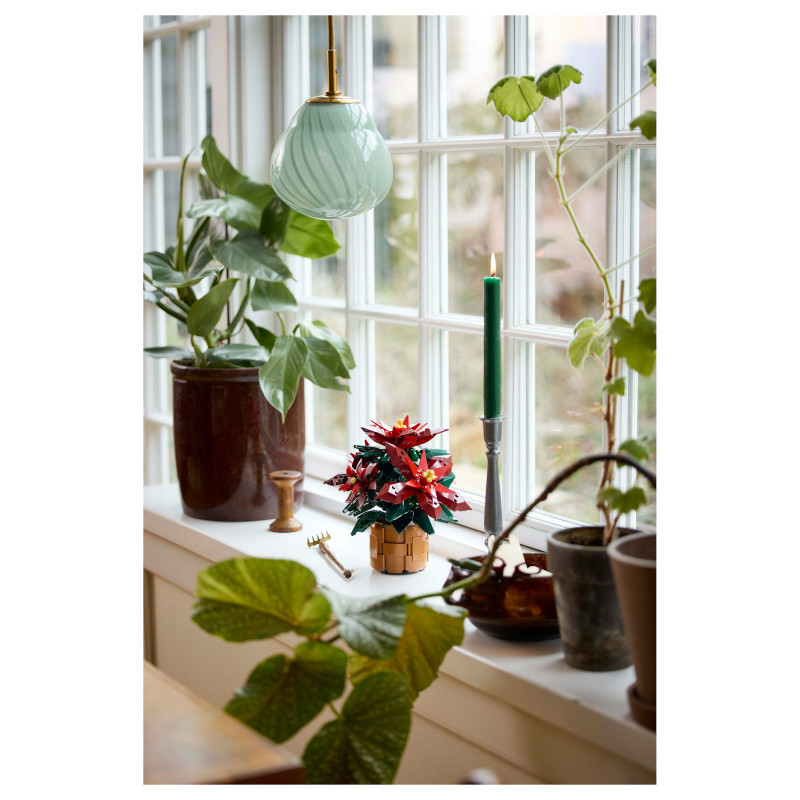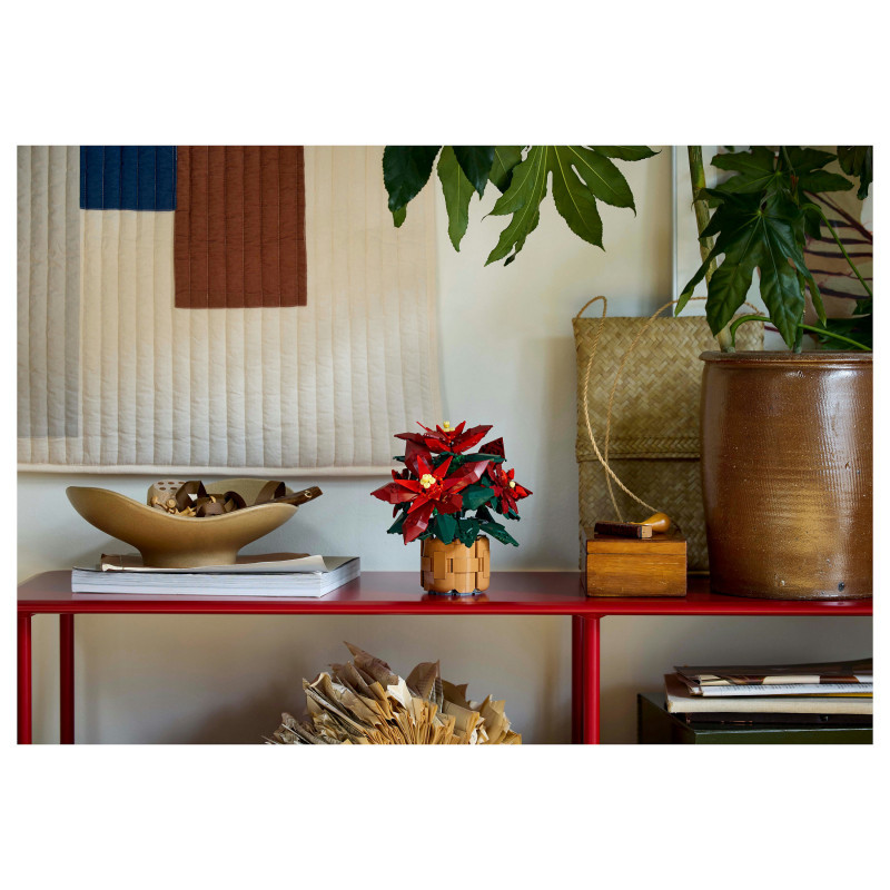 This posable LEGO plant replica depicts a ‘Grande Italia’ poinsettia nestled in a woven-basket flowerpot and features green leaves and 5 clusters of vibrant red leaves (bracts) with yellow cyathia at the centre. Easy to assemble, it delivers a rewarding building experience and makes an elegant display for the home and office.