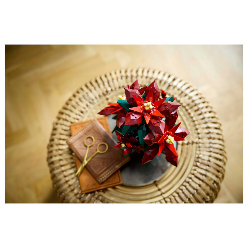 Posable LEGO® plant – This LEGO interpretation of the seasonal favourite is posable and features green leaves and 5 star-shaped clusters of red leaves (bracts) with yellow cyathia at the centre
