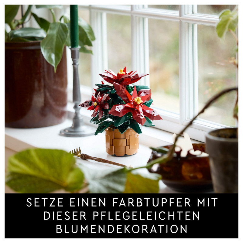 "LEGO Botanicals Poinsettia. Product type: Building set, Recommended age (min): 18 yr(s), Material: Plastic, Number of pieces: 608 pc(s). Package weight: 640 g"\n"Create an elegant, zero-maintenance floral display with this LEGO® Botanicals Poinsettia (10370) plant decor building set for adults. Indulge in a mindful building project or treat a loved one to this timeless floral display – a perfect gift idea for any occasion.