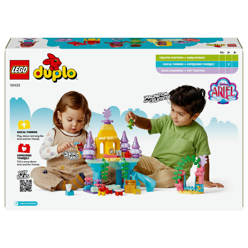 "LEGO DUPLO Ariel's Magical Underwater Palace. Product type: Building set, Recommended age (min): 2 yr(s), Material: Plastic, Number of pieces: 116 pc(s). Package weight: 1.97 kg"\n"Immerse fans of Disney’s The Little Mermaid in a world of undersea fun with the LEGO® DUPLO® | Disney Ariel’s Magical Underwater Palace (10435) building toy for preschool kids. Toddlers aged 2+ use their logical thinking and self-expression to recreate scenes from the Disney Junior TV show Ariel.
