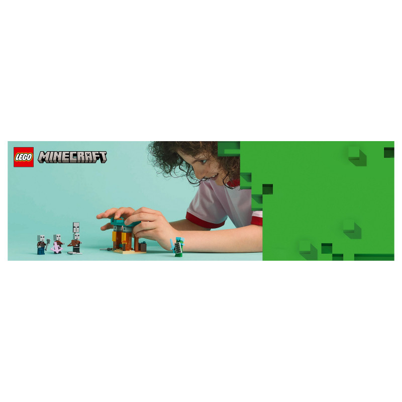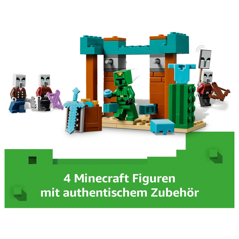 "LEGO Minecraft The Illager Desert Patrol. Product type: Building set, Recommended age (min): 7 yr(s), Material: Plastic, Number of pieces: 105 pc(s). Package weight: 166 g"\n"There’s big fun for Minecraft® players in this small LEGO® set for kids aged 7 and over. With 4 LEGO Minecraft figures, fun features and authentic accessories, The Illager Desert Patrol (21267) is a mini toy with mega Minecraft action.