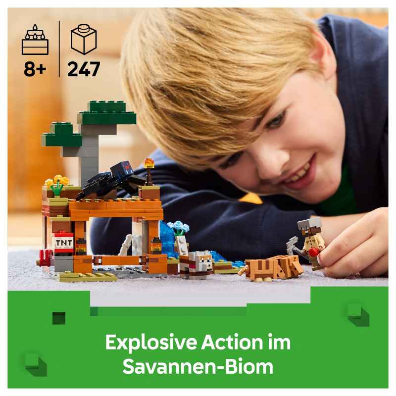 Set in the game’s savanna biome, the model features a mine with a lever-controlled TNT function that blasts away a piece of the terrain to reveal precious ore. There is a cave spider toy and a wolf, plus 2 armadillos, which provide the scutes used to craft wolf armour. At the side of the mine there is a small river and a lava fall. The set easily rearranges to inspire new adventures. For extra digital fun, the LEGO Builder app lets kids zoom in and rotate models in 3D using their device.