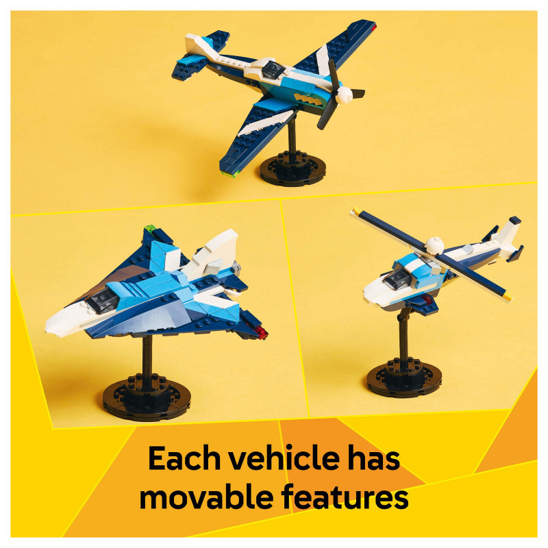 Kids can choose to build 3 different awesome vehicles: an airplane toy with a rotating propeller and moving wheels; a jet plane toy with moving wheels; and a helicopter model with a spinning rotor blade. Each model can be displayed on a brick-built stand and the set is an impressive gift for kids who enjoy playing out imaginative action-packed stories.