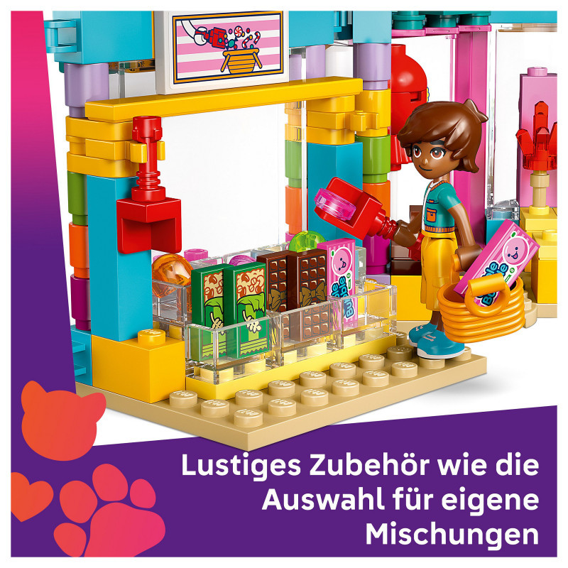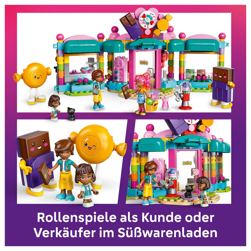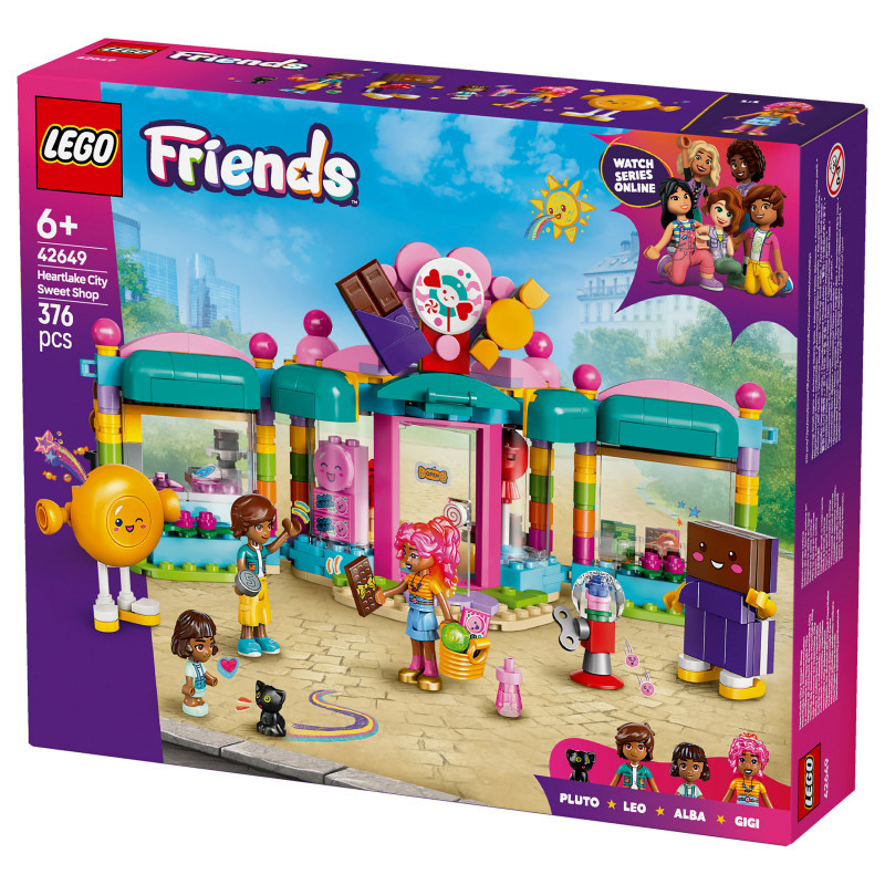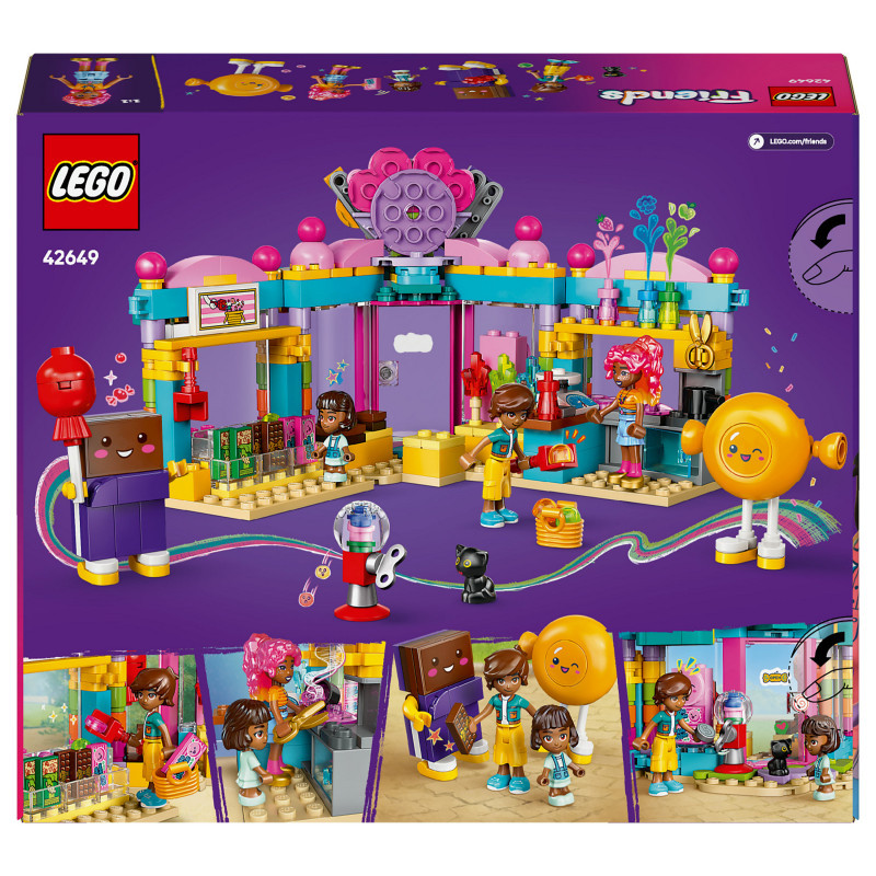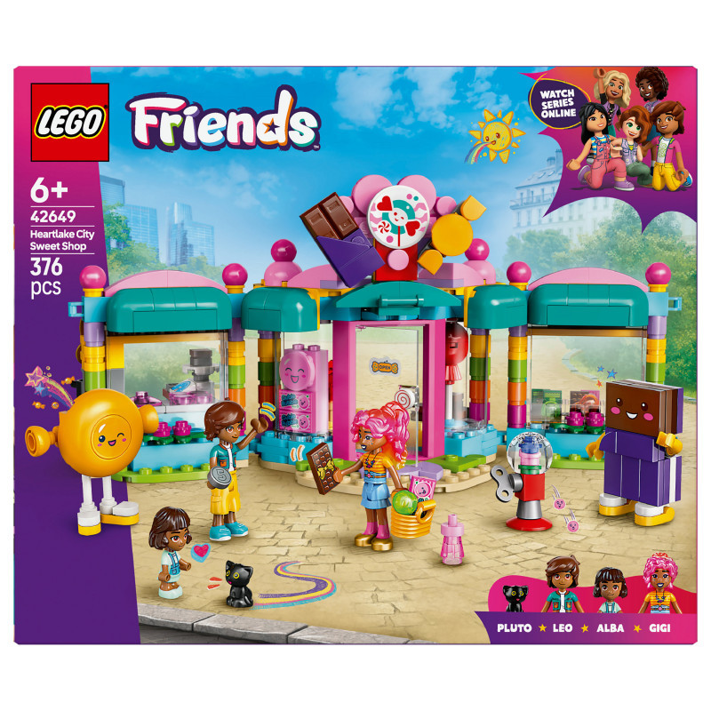 "LEGO Friends Heartlake City Sweet Shop. Product type: Building set, Recommended age (min): 6 yr(s), Material: Plastic, Number of pieces: 376 pc(s). Package weight: 493 g"\n"Here’s a sweet birthday gift for kids aged 6 and over who love pretend-play sets and shop toys. Girls, boys and young builders can explore the LEGO® Friends Heartlake City Sweet Shop (42649), which is packed with goodies and fun details. The set comes with 2 minidolls, a micro-doll, a cat figure and lots of accessories for creative play.