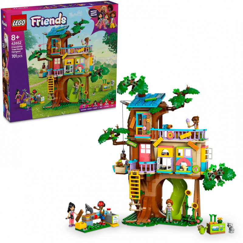"LEGO Friendship Tree House Hangout. Product type: Building set, Recommended age (min): 8 yr(s), Material: Plastic, Number of pieces: 701 pc(s). Package weight: 1.22 kg"\n"See imaginations grow with this LEGO® Friends Friendship Tree House Hangout (42652) building kit. This detailed kids’ set lets girls and boys aged 8 and over create their own friendship adventures. It comes with 4 LEGO Friends minidolls, a dog figure and a raccoon figure, plus a buildable workbench with tools.
