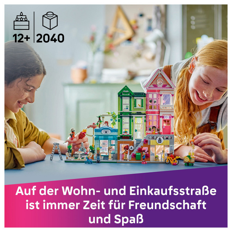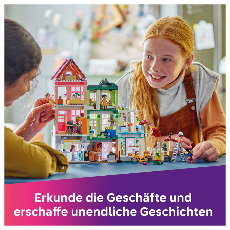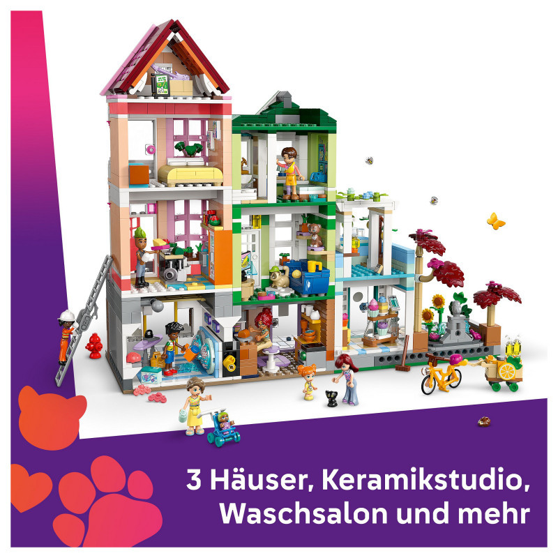 "LEGO Friends Heartlake City Apartments and Shops. Product type: Building set, Recommended age (min): 12 yr(s), Material: Plastic, Number of pieces: 2040 pc(s). Package weight: 2.9 kg"\n"Discover a model kit full of community spirit with the LEGO® Friends Heartlake City Apartments and Shops (42670) buildable toy. This set makes a great gift for kids aged 12 years old and over and includes 3 colourful LEGO houses, a bakery, a ceramics studio, a launderette and much more. There are lots of fun details and storylines to discover, plus 9 characters, including 7 minidolls and 3 cat figures.