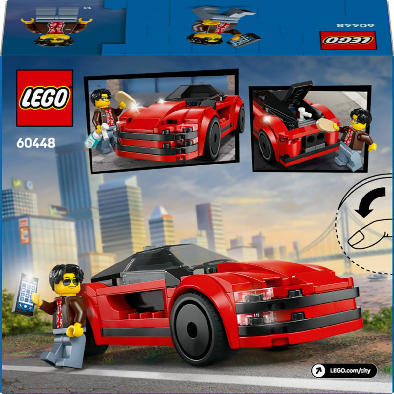 "LEGO Red Sports Car. Product type: Building set, Recommended age (min): 5 yr(s), Material: Plastic, Number of pieces: 109 pc(s). Package weight: 185 g"\n"Treat your young car enthusiast to the LEGO® City Red Sports Car vehicle set for ages 5 and over (60448). This sleek supercar toy features cool alloys, low-profile tyres and a tinted cockpit. Kids can pop the driver minifigure behind the wheel and store the included toy mobile phone and cleaning accessories in the boot before taking to the open road for high-speed adventures!