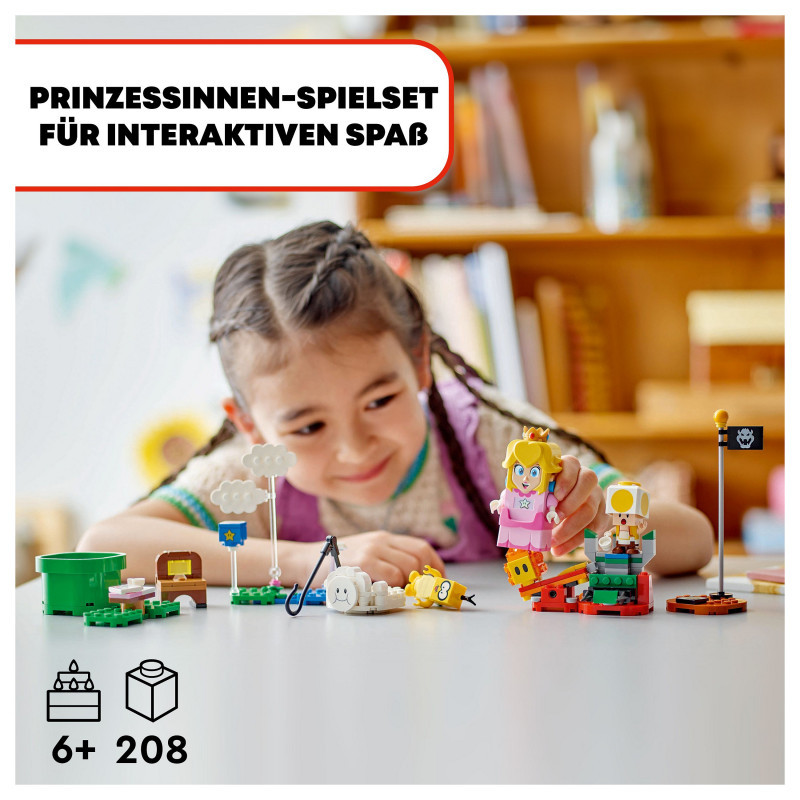 "LEGO Super Mario Adventures with Interactive ® Peach™. Product type: Building set, Recommended age (min): 6 yr(s), Material: Plastic, Number of pieces: 208 pc(s). Package weight: 447 g"\n"Join an iconic Super Mario™ character for a picnic and fly on a cloud to rescue the Yellow Toad with the Adventures with Interactive LEGO® Peach™ princess toy playset for kids (71441). A top Nintendo® gift for girls, boys and gamers aged 6 and over, the set features an interactive LEGO Peach figure, plus Lakitu, a Yellow Toad and a Lava Bubble. Travel from the Start Pipe to the Goal Pole triggering digital reactions from LEGO Peach and collecting coins along the way. Have a picnic, read a letter saying that the Yellow Toad has been captured, topple Lakitu from the cloud, and fly, flip and loop the loop on the cloud on the way to rescue the Yellow Toad. The buildable cloud toy also has a fishing pole for Lakitu to lift the Yellow Toad’s picnic seat.
