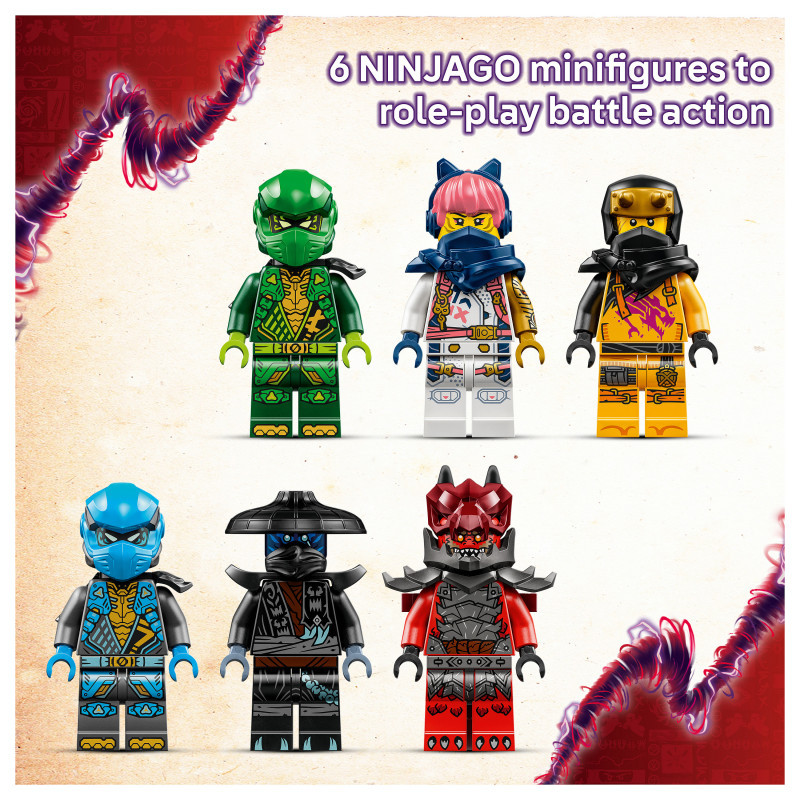 6 NINJAGO® minifigures – This LEGO® building set features ninja warriors Lloyd, Nya, Arin and Sora, plus Nokt and Tyr, who is the leader of the Dragonians, so kids can role-play good vs. evil battles