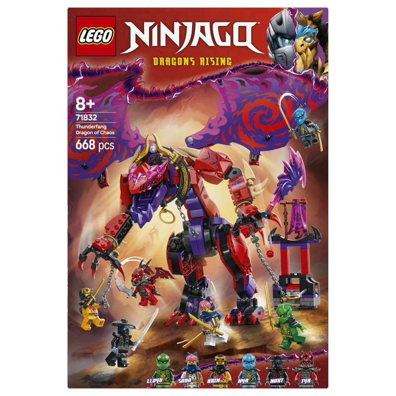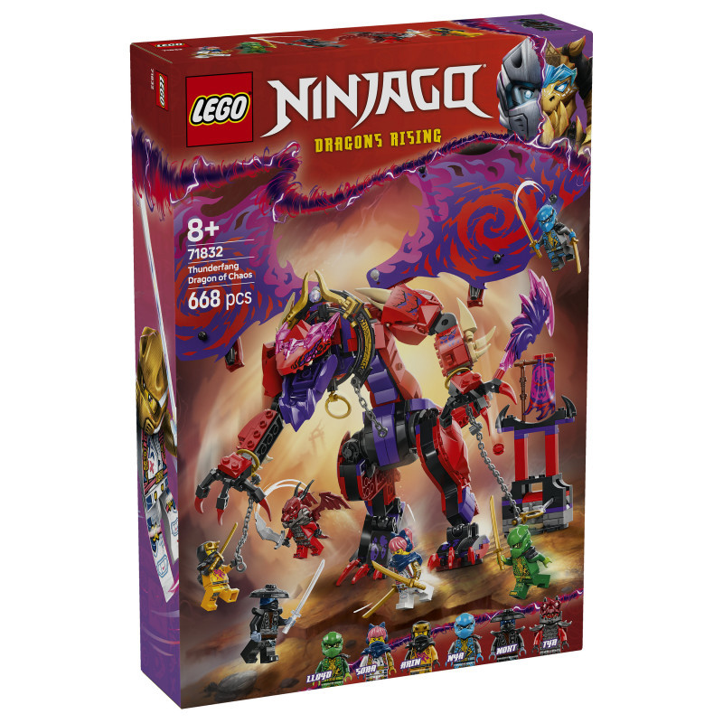 "LEGO NINJAGO Thunderfang Dragon of Chaos. Product type: Building set, Recommended age (min): 8 yr(s), Material: Plastic, Number of pieces: 668 pc(s). Package weight: 809 g"\n"The LEGO® NINJAGO® Thunderfang Dragon of Chaos (71832) ninja toy lets boys and girls aged 8 plus recreate thrilling action from season 3 of the NINJAGO Dragons Rising TV show. This building set for kids features a large dragon toy with a posable tail, legs, wings, feet, head and jaw, and a stud shooter under each wing. The dragon figure is chained to a small side build and can be released by unlocking it with 2 prismatic blade accessories.