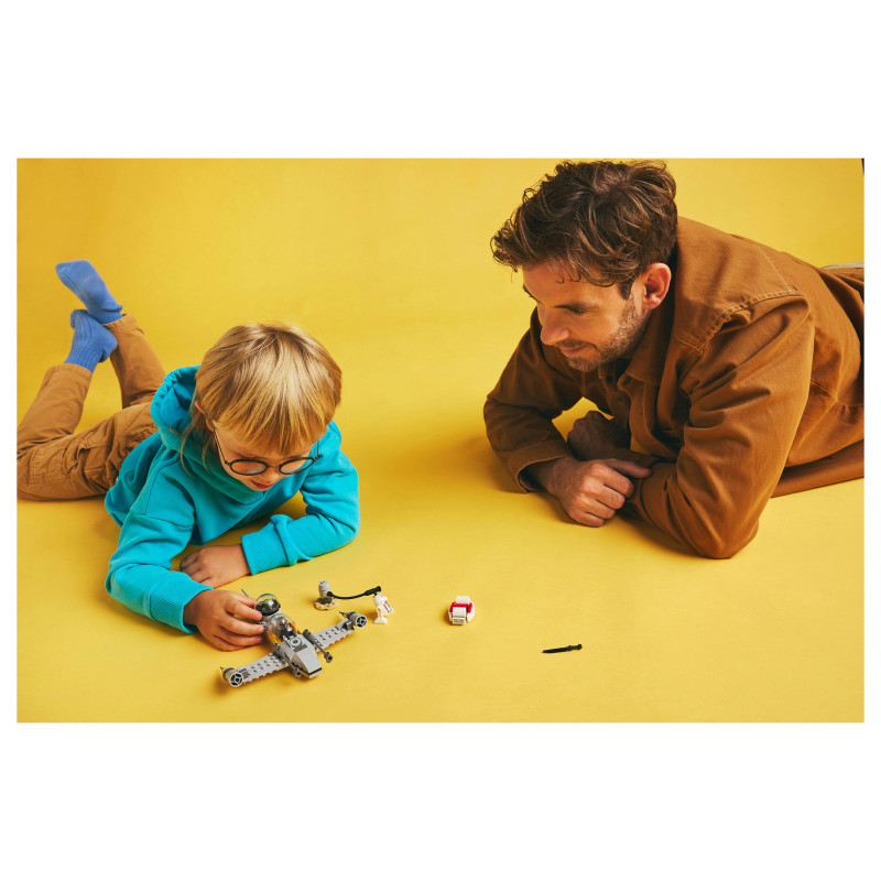 This N-1 Starfighter model building kit includes 3 LEGO Star Wars characters: The Mandalorian with a darksaber and jetpack accessory element, Grogu with a hover pram, and R5-D4. Place The Mandalorian in the N-1 Starfighter’s opening cockpit, and put Grogu in the passenger space at the rear.