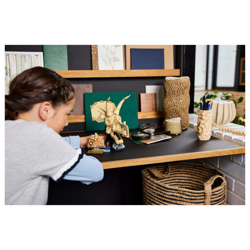 "LEGO Jurassic World Dinosaur Fossils: Triceratops Skull. Product type: Building set, Recommended age (min): 9 yr(s), Material: Plastic, Number of pieces: 468 pc(s). Package weight: 635 g"\n"Young palaeontologists aged 9 and over can enjoy imaginative Jurassic World play by collecting dinosaur fossils with this Dinosaur Fossils: Triceratops Skull (76969) LEGO® Jurassic World building kit. This model playset in the Dinosaur Fossils display series features a Triceratops skull with an opening jaw, a stand with a rock base, a dig site plate with mini-fossils and excavating tools, a LEGO minifigure, an information plaque and an ‘amber’ piece with an encased mosquito.