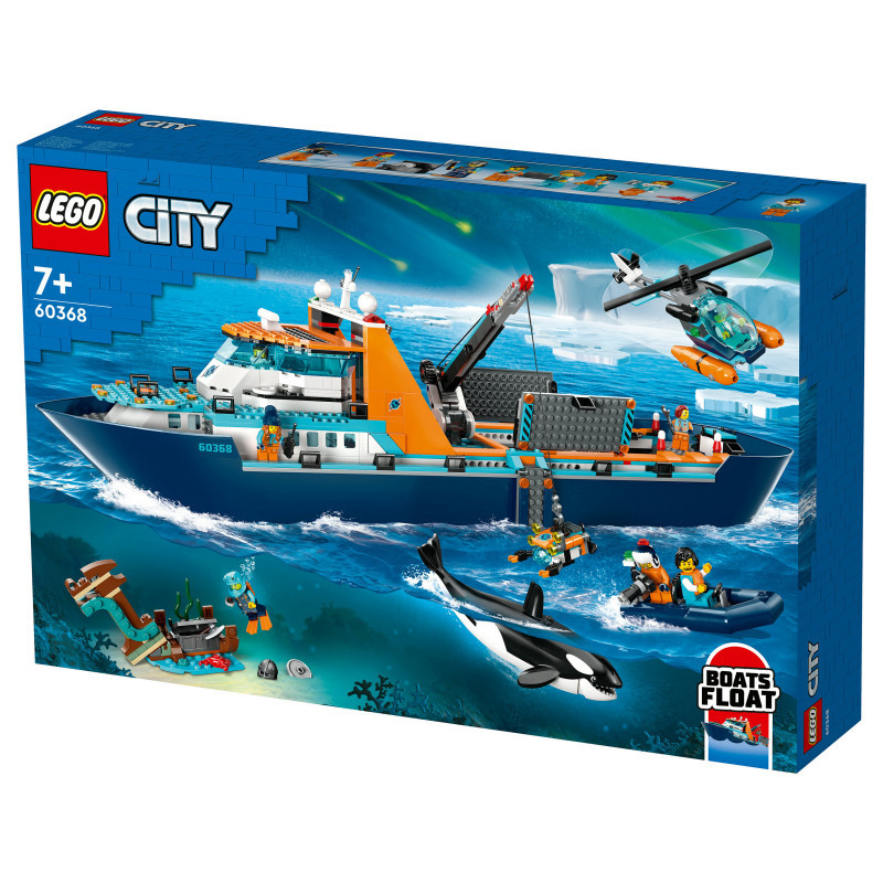 "LEGO City Arctic Explorer Ship. Product type: Building set, Recommended age (min): 7 yr(s), Material: Plastic, Number of pieces: 815 pc(s). Package weight: 2.66 kg"\n"Fun adventures lie on the horizon with the mighty LEGO® City Arctic Explorer Ship (60368). This huge floatable toy boat is loaded with realistic detailing for imaginative exploration adventures. This premium playset also includes a helicopter, dinghy, underwater ROV sub and a Viking shipwreck, plus a treasure chest, 7 minifigures and an orca figure.