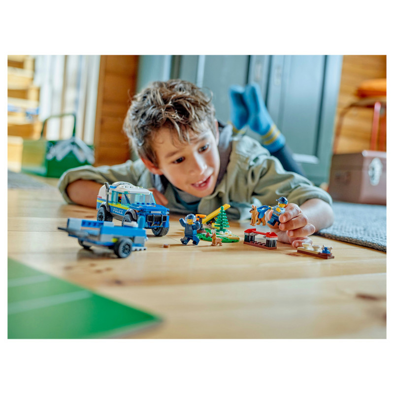 What’s in the box? – Everything kids need to build a toy police K9 SUV, trailer, 3 dog training apparatus and a training ground setting, plus 2 minifigures, a dog figure and a puppy figure