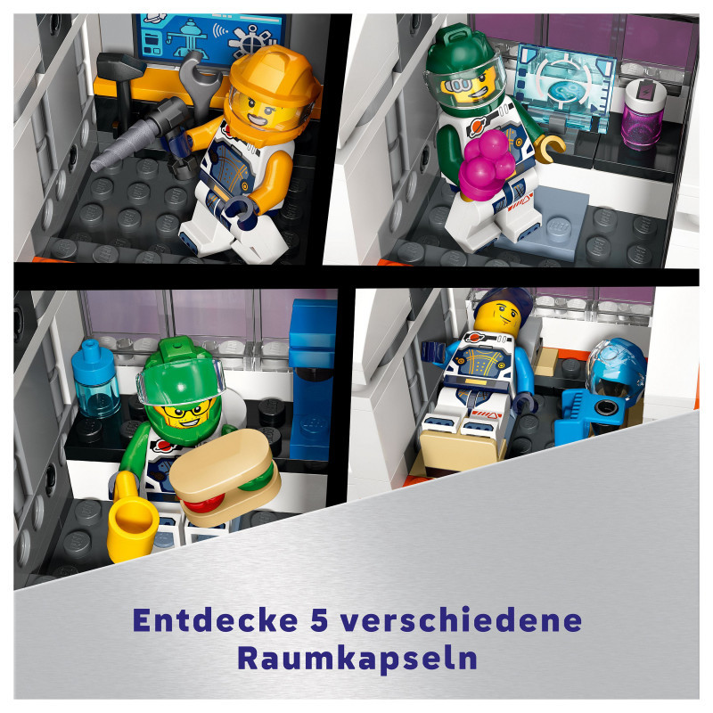 "LEGO City Modular Space Station. Product type: Building set, Recommended age (min): 7 yr(s), Material: Plastic, Number of pieces: 1097 pc(s). Package weight: 1.69 kg"\n"Treat a budding astronaut with the 7+ LEGO® City Modular Space Station model playset (60433). This futuristic space ring is an orbiting anchor for docking spacecraft and room pod modules, including a satellite, space bike, shuttle, exploration science lab, repair workshop, kitchen, sleeping quarters and a biodome. Kids can switch the modules around to create their perfect space station and connect them to the shuttle to create a cool space train. The set also features 6 space crew minifigures for epic space adventures.