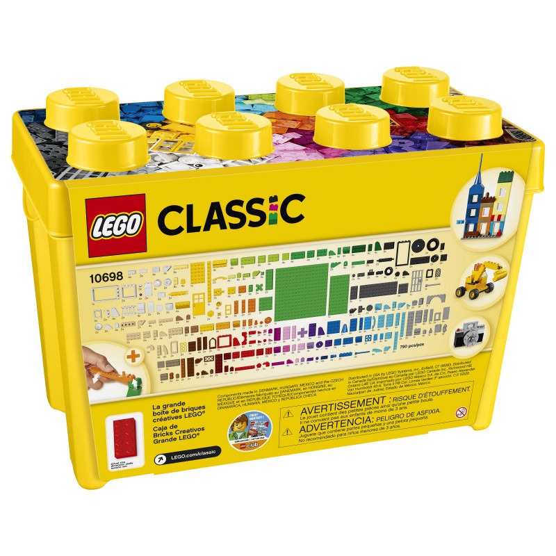 "LEGO Classic Large Creative Brick Box Set 10698. Product type: Building set, Recommended age (min): 4 yr(s), Number of pieces: 790 pc(s). Package weight: 1.59 kg"\n"Young builders can build up a storm with this big box of classic LEGO building bricks in 33 different colours. The LEGO Classic Large Creative Brick Box set (10698) comes with lots of different windows and doors, along with other special pieces and toy bricks to inspire. With some ideas to get kids started, they can really run with their imagination. This set provides the perfect creative toolkit for budding builders of all ages to enjoy some classic LEGO construction. It comes in a convenient plastic LEGO toy storage box and is an ideal supplement to any existing LEGO collection.