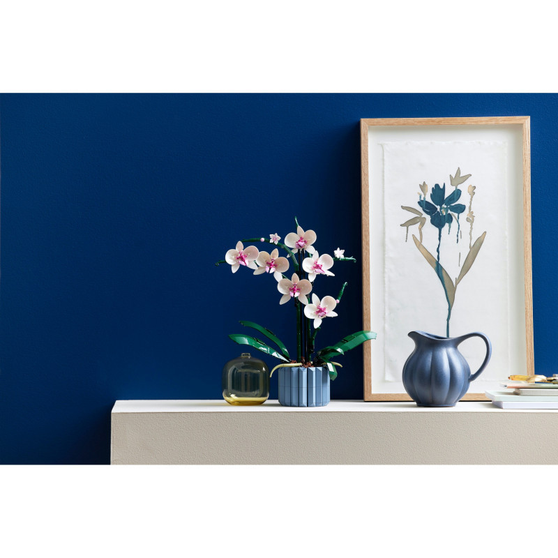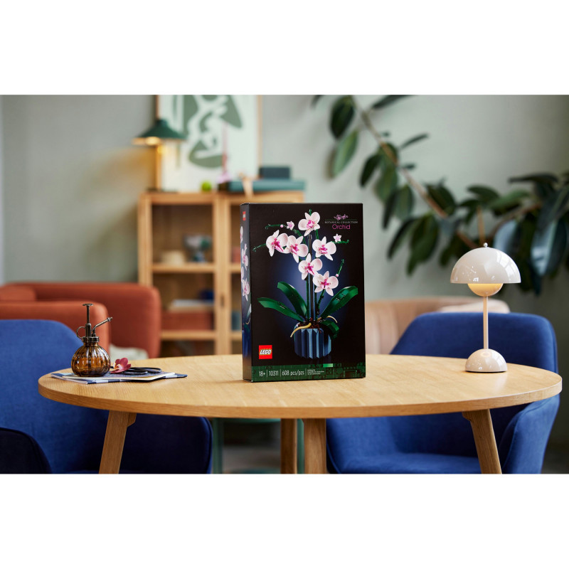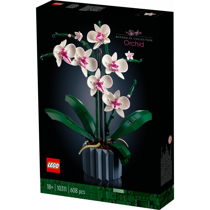 "LEGO Creator Expert Orchid. Product type: Building set, Recommended age (min): 18 yr(s), Material: Plastic, Number of pieces: 608 pc(s). Package weight: 758 g"\n"Enjoy a mindful building project and create a beautiful plant display for your home with this LEGO® Orchid (10311) model building project for adults. Take your time crafting all the details of the white and pink flowers and the vase. Inspired by a real orchid, the model has 5 leaves at the base and 2 wandering air roots to create an authentic display. Build the blue fluted vase and fill it with the brown LEGO elements to recreate the bark mix that a real orchid would grow in.
