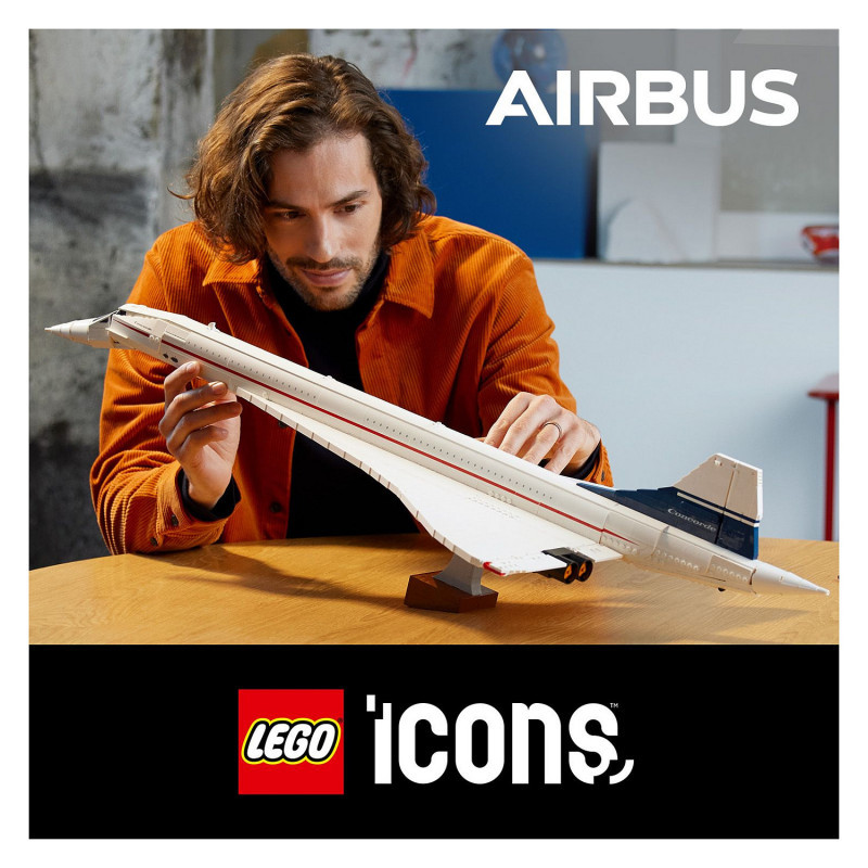 "LEGO ICONS Concorde. Product type: Building set, Recommended age (min): 18 yr(s), Material: Plastic, Number of pieces: 2083 pc(s). Package weight: 3.37 kg"\n"Embark on a supersonic journey with the LEGO® Icons Concorde (10318) model building set for adults. Take time out for a mindful building experience as you craft a detailed replica model of the world’s most famous supersonic commercial passenger aeroplane.