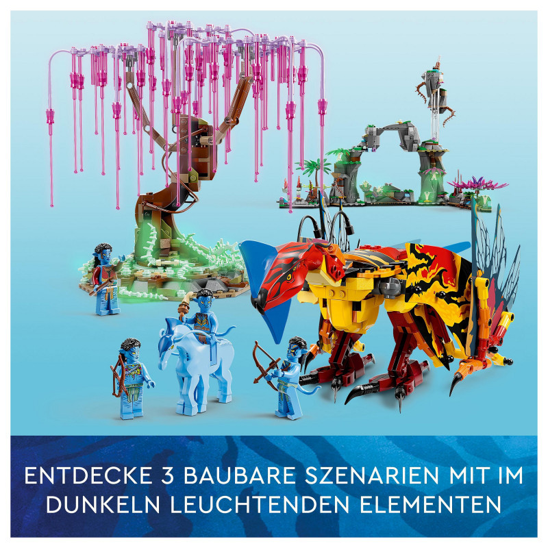 What’s in the box – This LEGO® set includes 4 minifigures, Toruk and Direhorse animal figures with connectors, a buildable Tree of Souls and 3 environment scenes with glow-in-the-dark elements