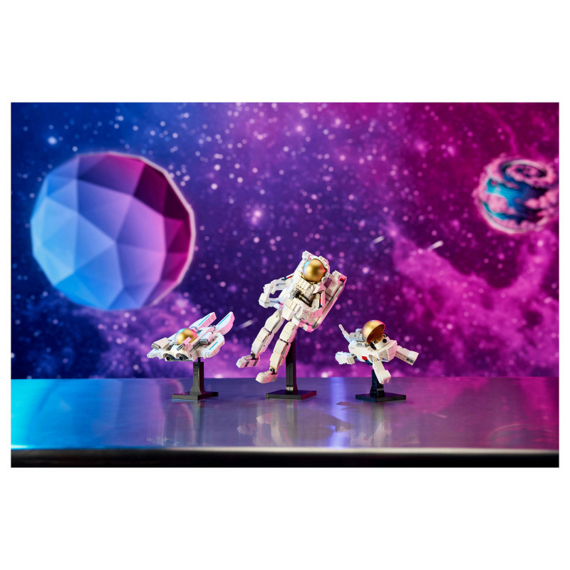 Boys and girls can build 3 different space playsets: a posable space astronaut, a futuristic space dog with posable legs and tail, or a space viper jet with a seat for a minifigure (not included) to pilot it. All 3 models make great space-themed creative gifts and come with stands for display.