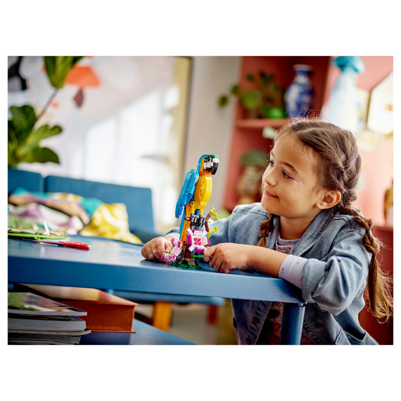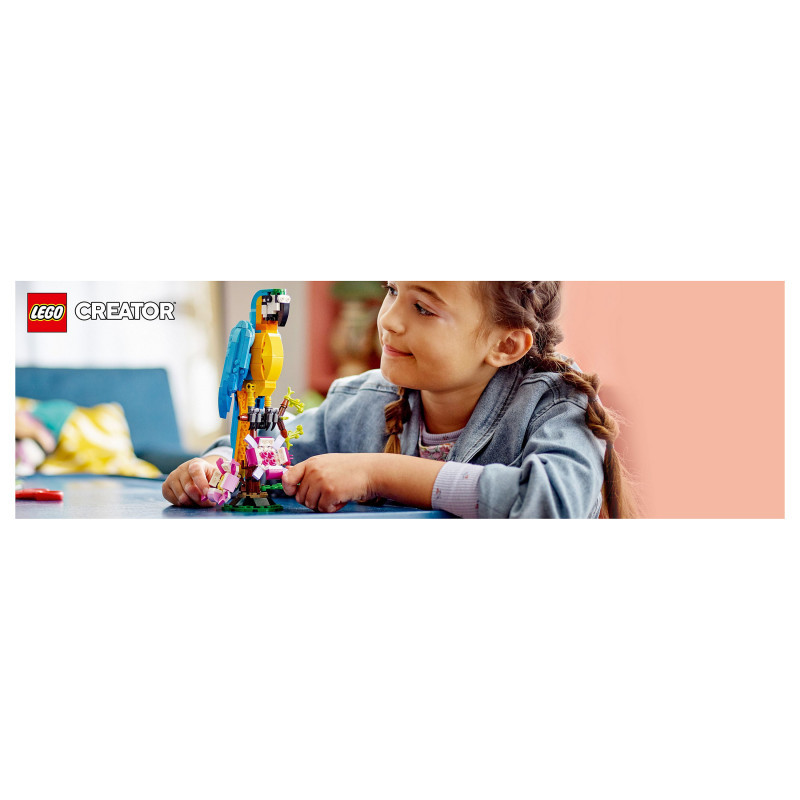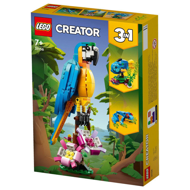 "LEGO Creator Exotic Parrot. Product type: Building set, Recommended age (min): 7 yr(s), Theme: LEGO Creator, Material: Plastic, Number of pieces: 253 pc(s). Package weight: 361 g"\n"Little builders and passionate animal fans aged 7+ can travel deep into the rainforest for action-packed stories with this LEGO® Creator 3in1 Exotic Parrot (31136) building set. It features a colourful parrot that can fully rotate its body while sitting on a tree branch and move its wings and tail.