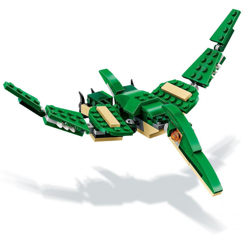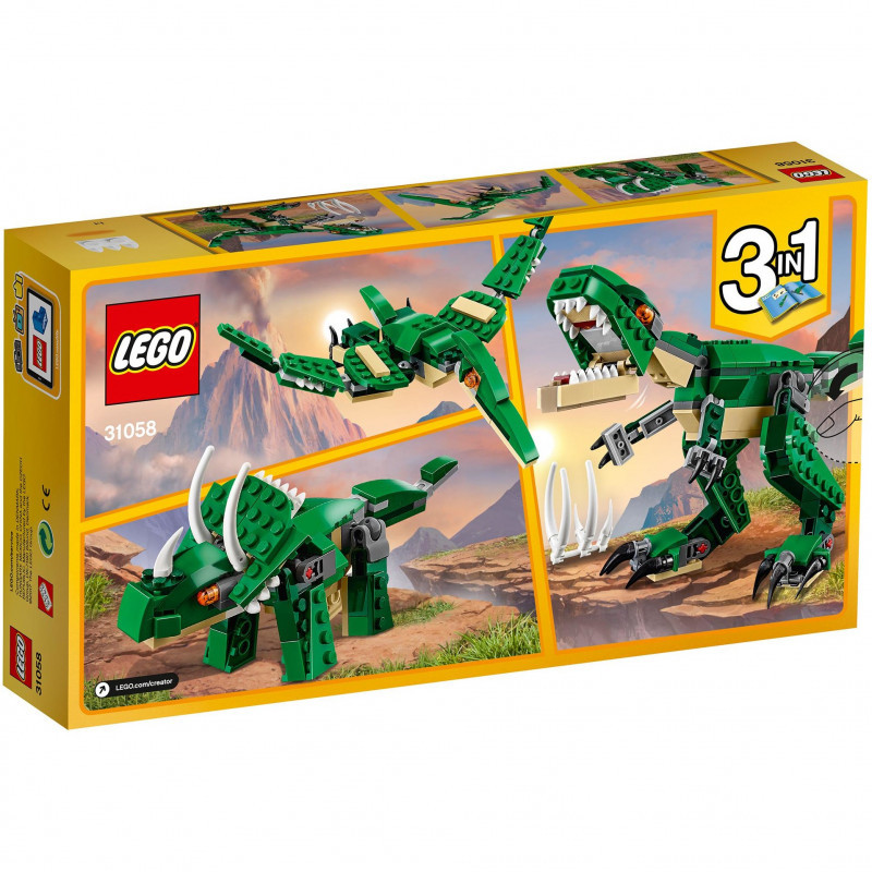 "LEGO Creator 3in1 Mighty Dinosaurs Model Set 31058. Product type: Building set, Recommended age (min): 7 yr(s), Number of pieces: 174 pc(s). Package weight: 250 g"\n"Have fun with the awesome T. rex, featuring a dark-green and beige color scheme, bright orange eyes, posable joints and head, large claws and an opening mouth with pointed teeth. Also includes the dinosaur’s prey in the form of a buildable rib cage. Rebuild this 3-in-1 LEGO Creator Mighty Dinosaurs model to create a Triceratops or a Pterodactyl.