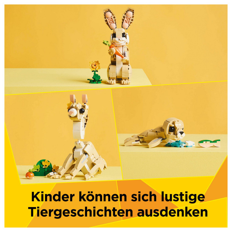 "LEGO Creator Cute Bunny. Product type: Building set, Recommended age (min): 8 yr(s), Material: Plastic, Number of pieces: 326 pc(s). Package weight: 432 g"\n"Let animal-loving kids aged 8 and over enjoy fun adventures with this LEGO® Creator 3in1 Cute Bunny (31162) building set. The animal playset features a bunny toy for kids with a posable head, ears, forelegs and hindlegs, who can stand on either 2 or 4 legs, and comes with a sunflower and a carrot.