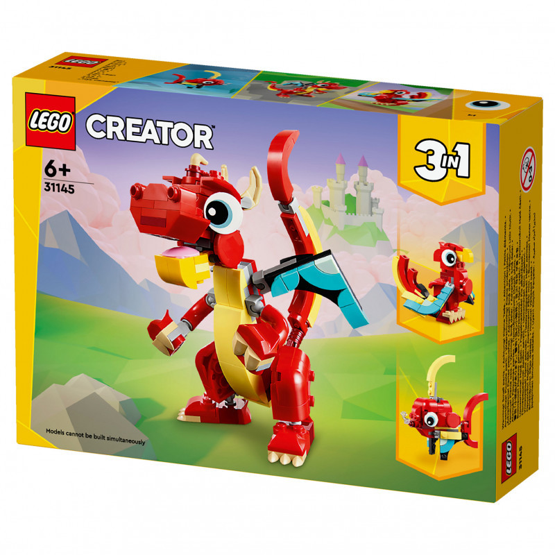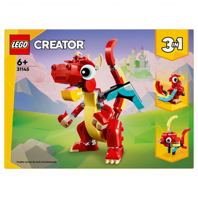 "LEGO Creator Red Dragon. Product type: Building set, Recommended age (min): 6 yr(s), Material: Plastic, Number of pieces: 149 pc(s). Package weight: 185 g"\n"Creative kids aged 6+ can travel to a magical land for fun-filled stories with this 3in1 Red Dragon (31145) animal toy building set. It features a friendly dragon toy, which has big eyes and posable arms, hands, wings, legs, feet, head and mouth, so kids can choose how to use it for playtime adventures and display afterwards.
