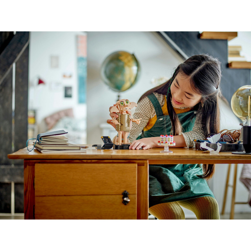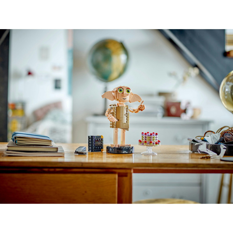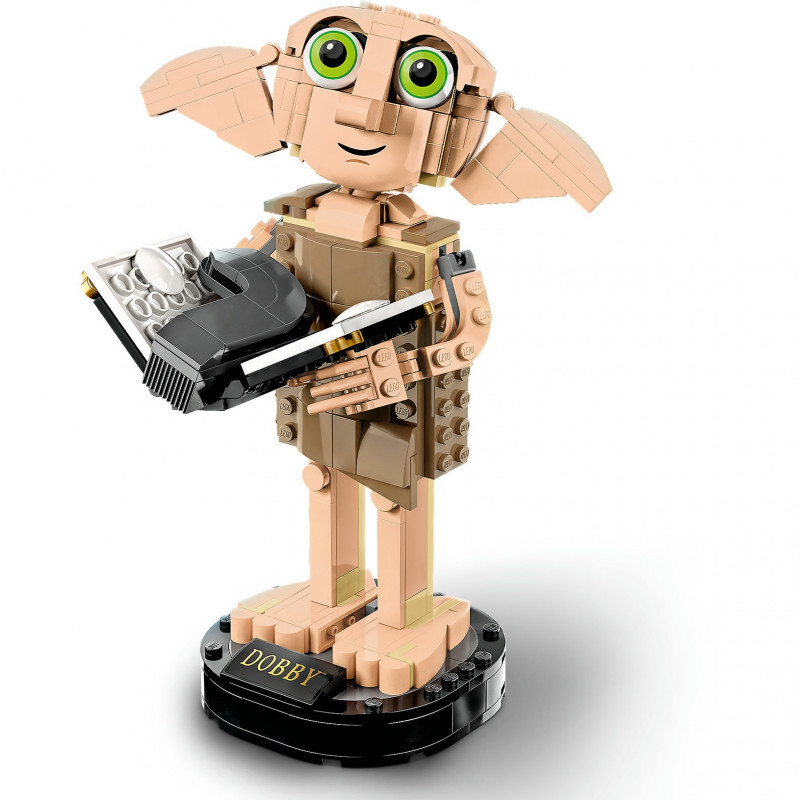 "LEGO Harry Potter Dobby™ the House-Elf. Product type: Building set, Recommended age (min): 8 yr(s), Material: Plastic, Number of pieces: 403 pc(s). Package weight: 451 g"\n"Delight Harry Potter™ fans with the first-ever LEGO® brick model of Dobby™ the House-Elf. The instantly recognisable brick-built figure has a posable head for different looks, and posable arms and fingers so Dobby can hold the included iconic accessories. There is a detailed buildable model of Harry Potter’s sock with Tom Riddle’s diary that Harry used to set Dobby free and Aunt Petunia’s ‘floating’ pudding cake to inspire memories of classic scenes.