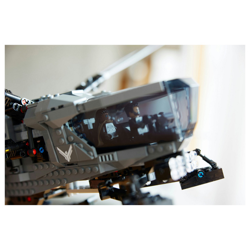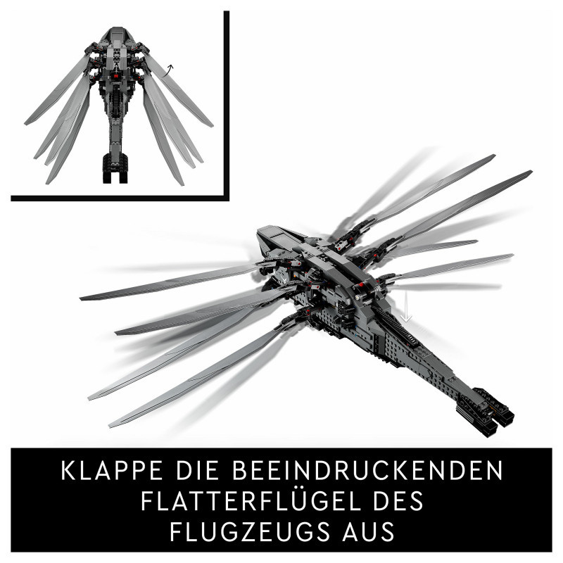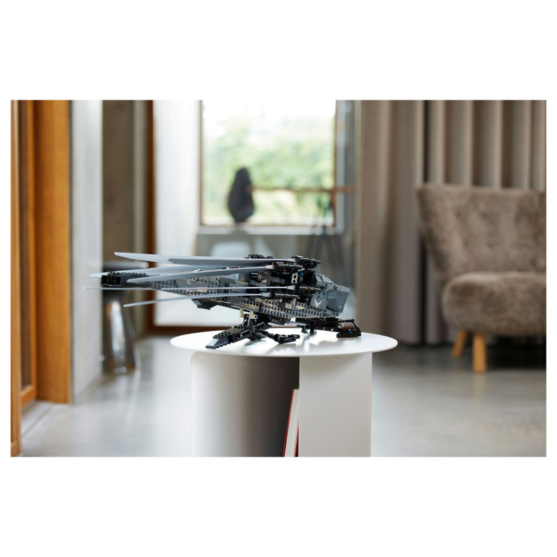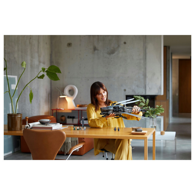 What’s in the box? – Everything you need to craft a LEGO® replica of the Dune Atreides Royal Ornithopter aircraft with fold-out, flappable wings and deployable landing gear, plus 8 film minifigures