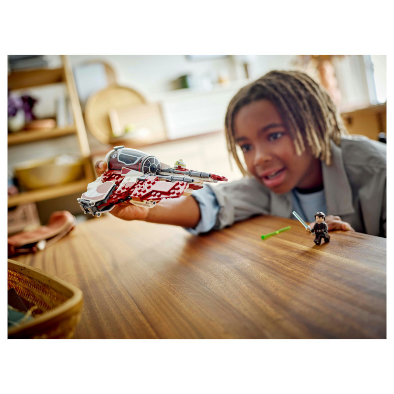 "LEGO Star Wars Ahsoka's Jedi Interceptor™. Product type: Building set, Recommended age (min): 8 yr(s), Material: Plastic, Number of pieces: 290 pc(s). Package weight: 448 g"\n"Let kids create their own exciting Star Wars: The Clone Wars™ adventures with Ahsoka’s Jedi Interceptor Starfighter Building Toy (75401). A cool LEGO® Star Wars™ gift idea for boys, girls and fans aged 8 and over, this brick-built Jedi Interceptor features an opening cockpit, adjustable wings for attack and cruise modes, and 2 spring-loaded shooters. The buildable playset includes 2 LEGO Star Wars minifigures – Ahsoka Tano and Anakin Skywalker with Lightsabers™ – plus an R7-A7 LEGO droid figure for fantasy play. Ahsoka can be placed in the Jedi Interceptor’s cockpit, and there’s room on board for R7-A7 and storage for Ahsoka’s Lightsabers™.