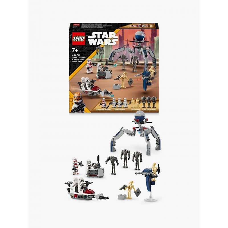 "LEGO Star Wars Clone Trooper™ & Battle Droid™ Battle Pack. Product type: Building set, Recommended age (min): 7 yr(s), Material: Plastic, Number of pieces: 215 pc(s). Package weight: 227 g"\n"Inspire youngsters to recreate thrilling Star Wars: The Clone Wars scenes with this LEGO® Star Wars™ Clone Trooper & Battle Droid Battle Pack (75372) for ages 7 and over. It features 4 LEGO Star Wars minifigures and 5 LEGO figures – a Clone Shock Trooper, 3 Clone Troopers, 3 Super Battle Droids and 2 Battle Droids – with iconic weapons for action play. This LEGO building set also includes a stud-shooting Star Wars speeder bike for 2 Clone Troopers and a buildable STAP speeder vehicle toy for a Battle Droid. A tri-droid with 3 flick shooters and a defensive post with a stud shooter add even more creative-play possibilities.