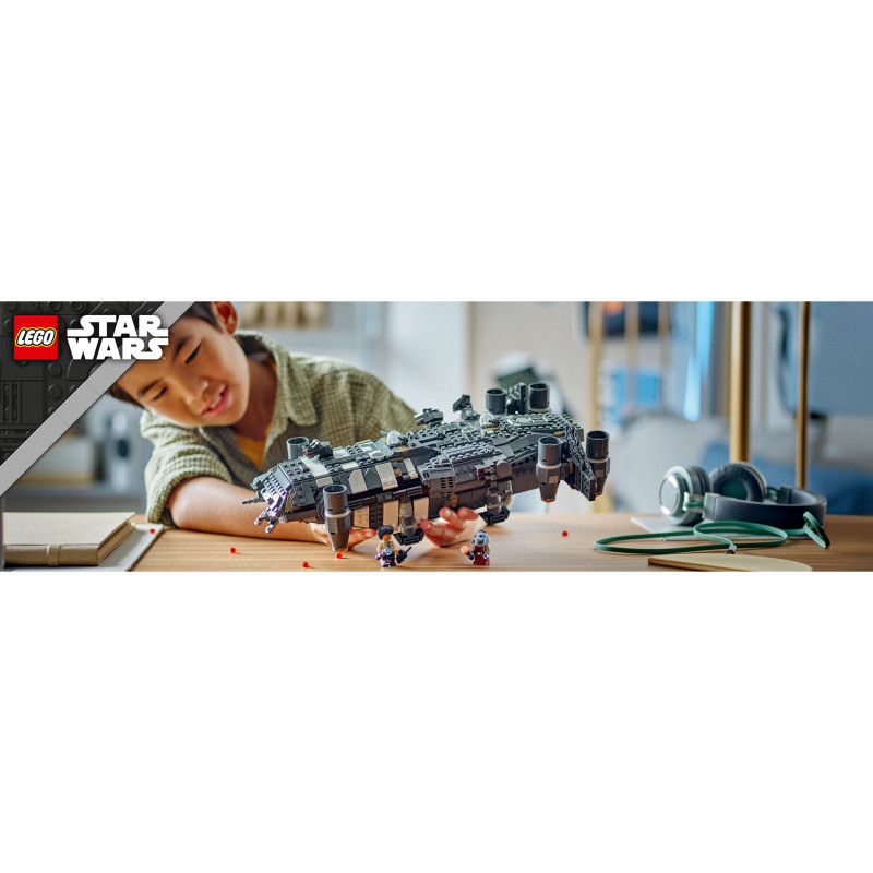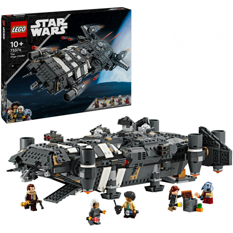 "LEGO Star Wars The Onyx Cinder. Product type: Building set, Recommended age (min): 10 yr(s), Material: Plastic, Number of pieces: 1325 pc(s). Package weight: 1.8 kg"\n"Kids become the heroes in their own Star Wars: Skeleton Crew stories with a detailed LEGO® brick recreation of The Onyx Cinder (75374). This collectible LEGO Star Wars™ buildable starship toy features rotating engines for landing/takeoff or flight, 2 stud shooters, 2 rotating turrets, each with 2 stud shooters, and a grabbing claw. It has seats for all 5 included LEGO Star Wars characters (the Jod LEGO minifigure in the cockpit and Wim, Fern, KB and Neel in the passenger compartment), plus storage for the 4 buildable torches and other cargo. There is also a kitchen table and a bed, plus accessory elements including fruit and a walkie-talkie to inspire creative play.