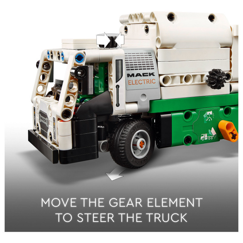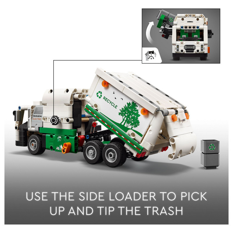 Truck toy for kids aged 8+ – The LEGO® Technic Mack® LR Electric Garbage Truck for boys and girls features a side loader to grab, lift and tip the rubbish bins