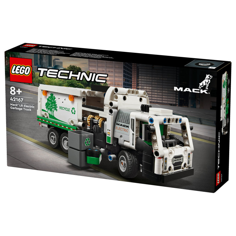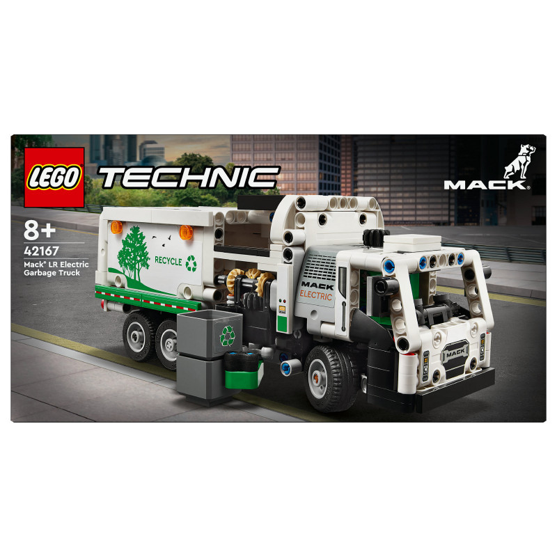 "LEGO Technic Mack® LR Electric Garbage Truck. Product type: Building set, Recommended age (min): 8 yr(s), Material: Plastic, Number of pieces: 503 pc(s). Package weight: 709 g"\n"Inspire kids who love vehicles to think about green energy and keeping the city clean with this LEGO® Technic Mack® LR Electric Garbage Truck toy (42167) for boys and girls aged 8+. This recycling truck toy is inspired by the cutting-edge Mack electric garbage truck and features realistic movement and features. Model not motorized.