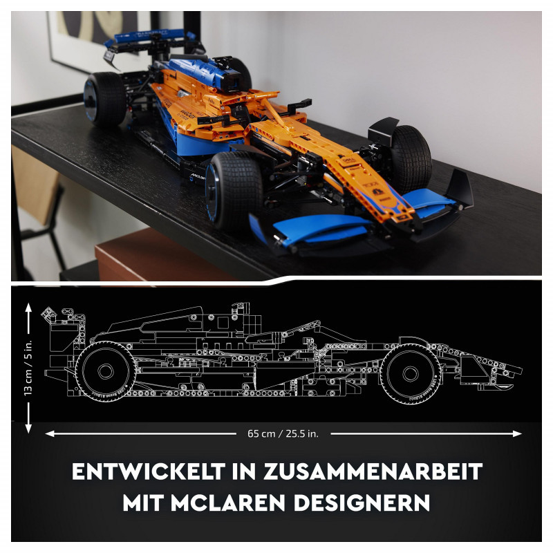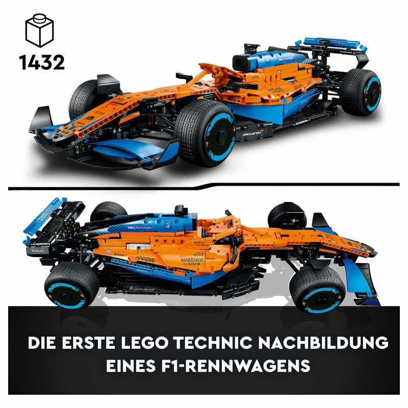 "LEGO Technic McLaren Formula 1™ Race Car. Product type: Building set, Recommended age (min): 18 yr(s), Material: Plastic, Number of pieces: 1434 pc(s). Package weight: 2.27 kg"\n"Remove all distractions. Channel your competitor's focus. It’s time to build a highly detailed LEGO® Technic McLaren Formula 1™ Race Car 42141 model. When you cross the finish line, you’ll feel immense pride – with an impressive display model to celebrate your dedication.