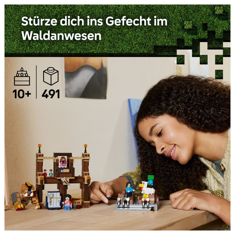 LEGO® Minecraft® gamer merch – Kids who love Minecraft and the Minecraft film can bring video game battle scenes to life with the Woodland Mansion Fighting Ring for boys and girls aged 10 and over