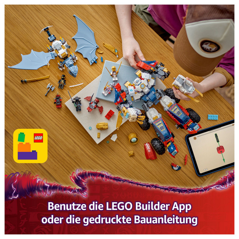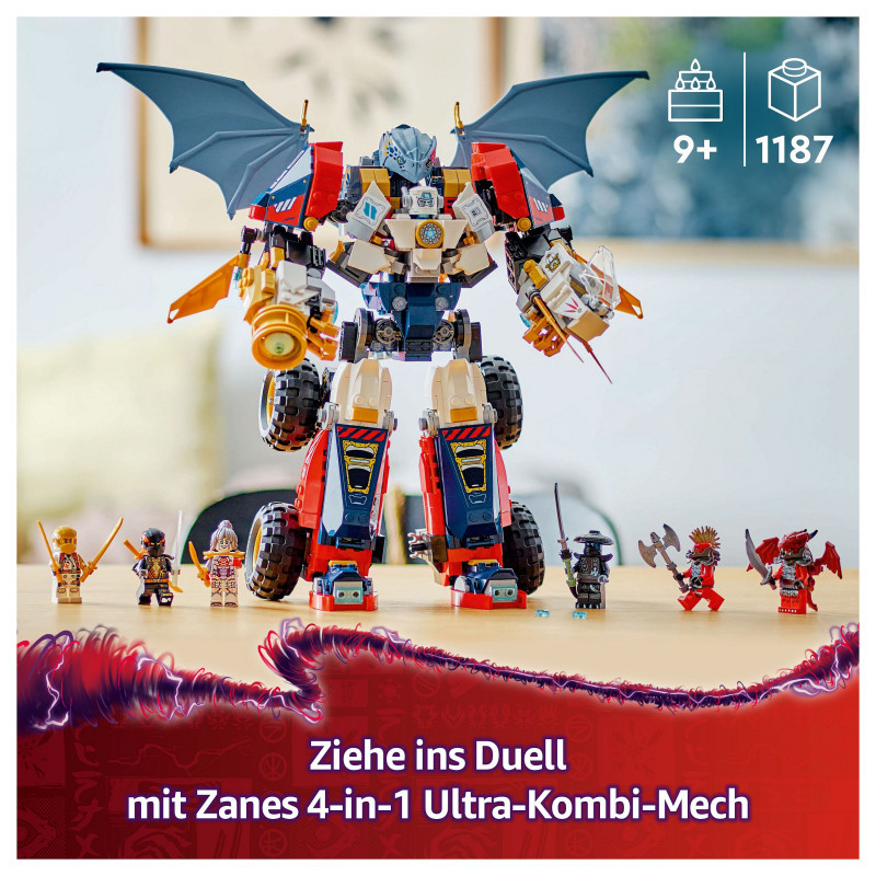 "LEGO NINJAGO Zane's Ultra Combiner Mech. Product type: Building set, Recommended age (min): 9 yr(s), Material: Plastic, Number of pieces: 1187 pc(s). Package weight: 1.54 kg"\n"Boys and girls aged 9 and over can enjoy endless play possibilities recreating exciting action from season 3 of the NINJAGO® Dragons Rising TV show with Zane’s Ultra Combiner Mech (71834) toy 4-in-1 building set.