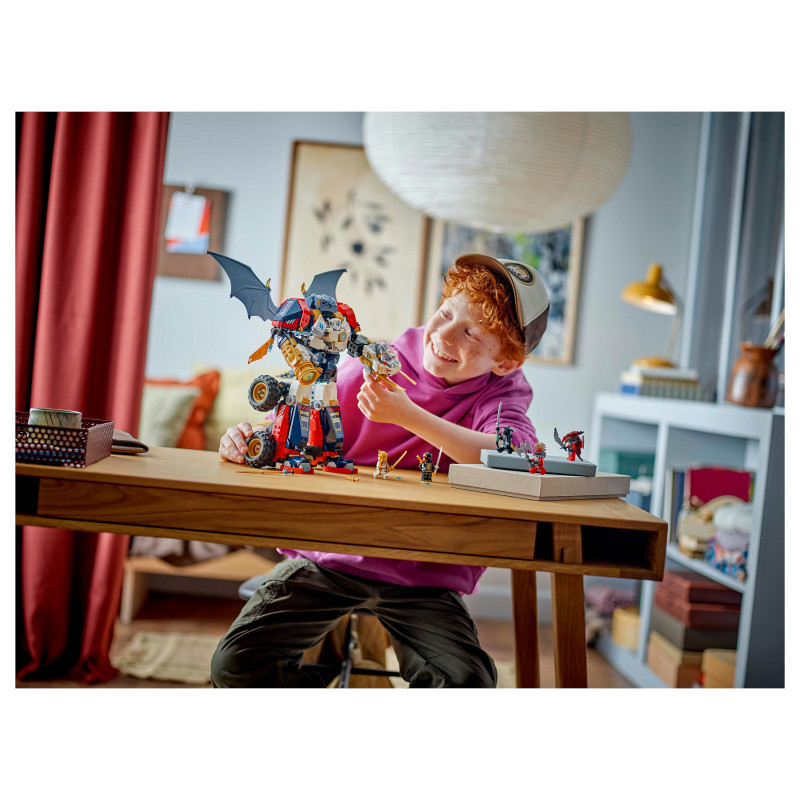 Posable NINJAGO® toy – The large combiner mech has posable legs, feet, arms, wrists, fingers and head, plus dragon wings, a cockpit, 2 shooters and a large sword accessory