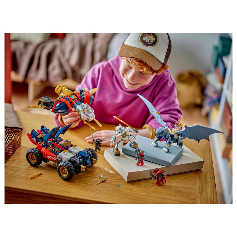 Kids can play with the stunning large combiner mech, which has posable legs, feet, arms, wrists, fingers and head, dragon wings, plus a cockpit and 2 shooters. They can then separate it into 4 smaller models: a dragon toy with posable features and wings; a jet toy with movable engines and a rotatable cockpit; a car toy with 4 large off-road wheels and 2 opening cockpits, including one with hidden blasters; and a Zane action figure.