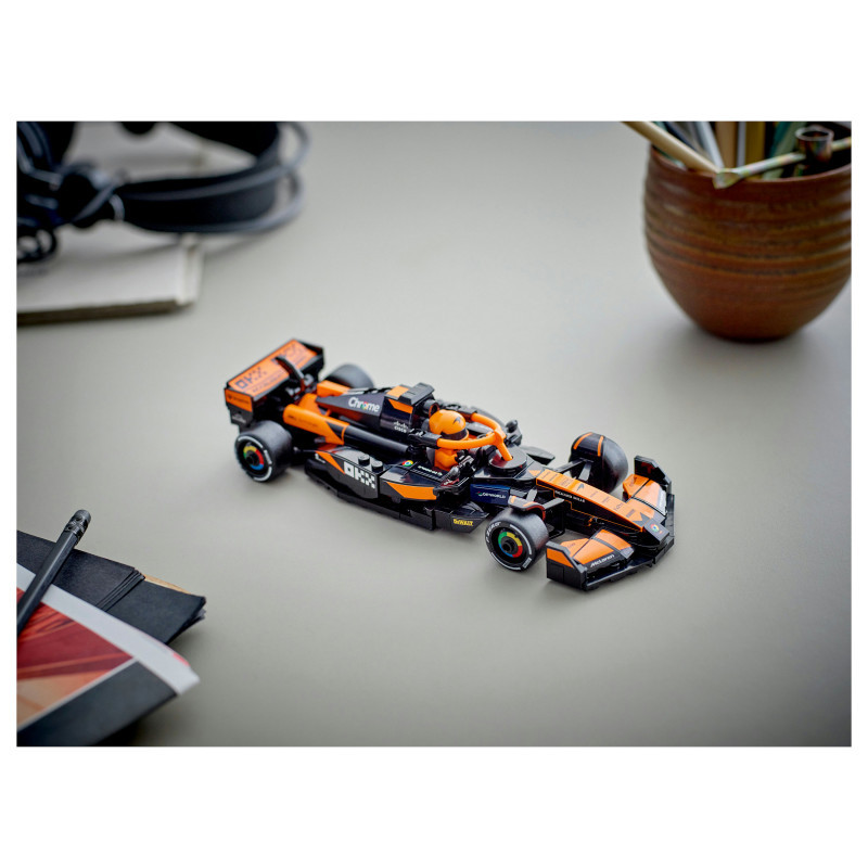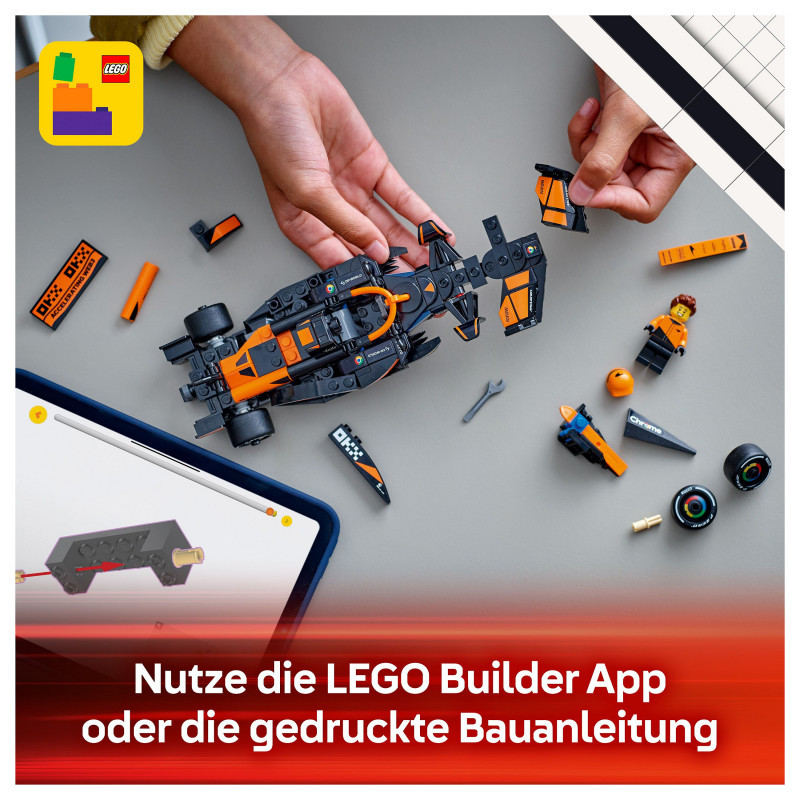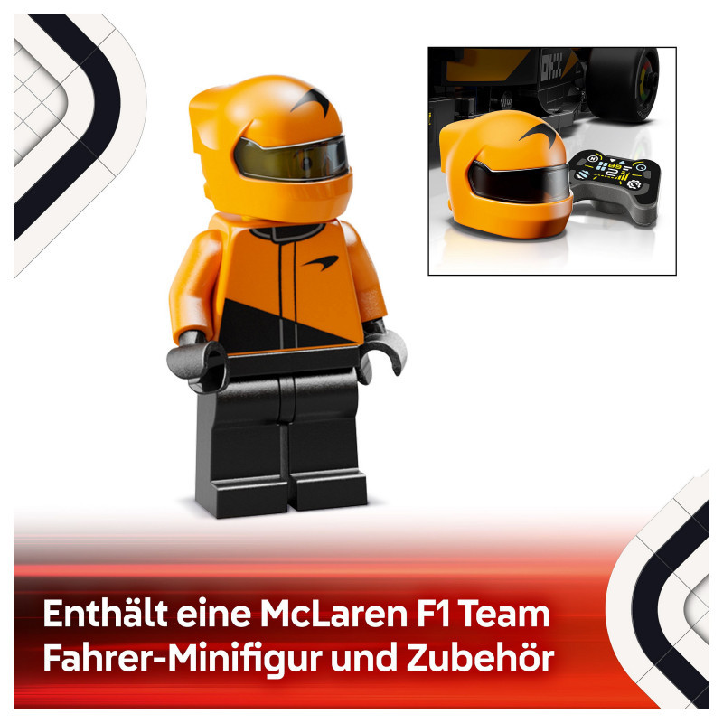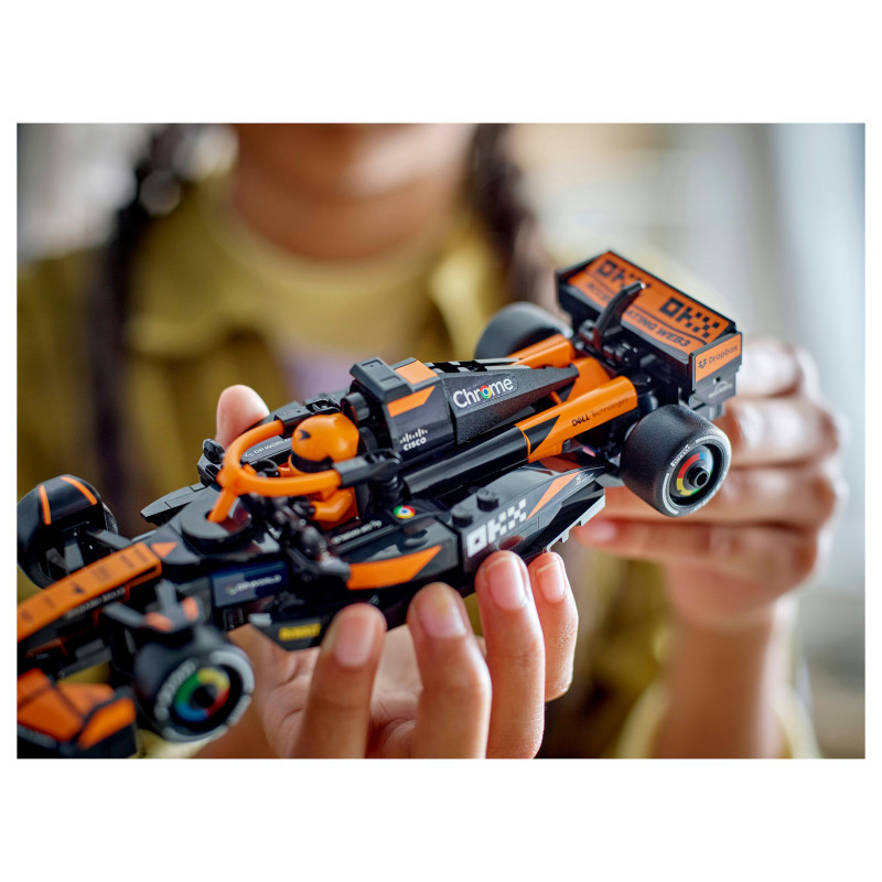 The F1 model car features a cockpit that opens by lifting the halo bar, a rear wing, wishbone suspension, sponsor stickers and wider rear tyres imprinted with “Pirelli”. The toy vehicle also comes with a driver minifigure wearing a McLaren outfit and a winged helmet to place inside the cockpit for racing action.