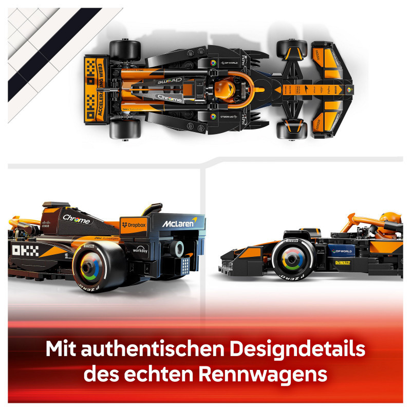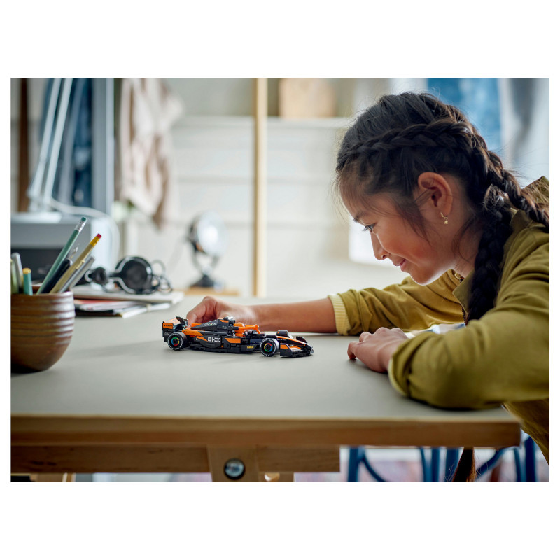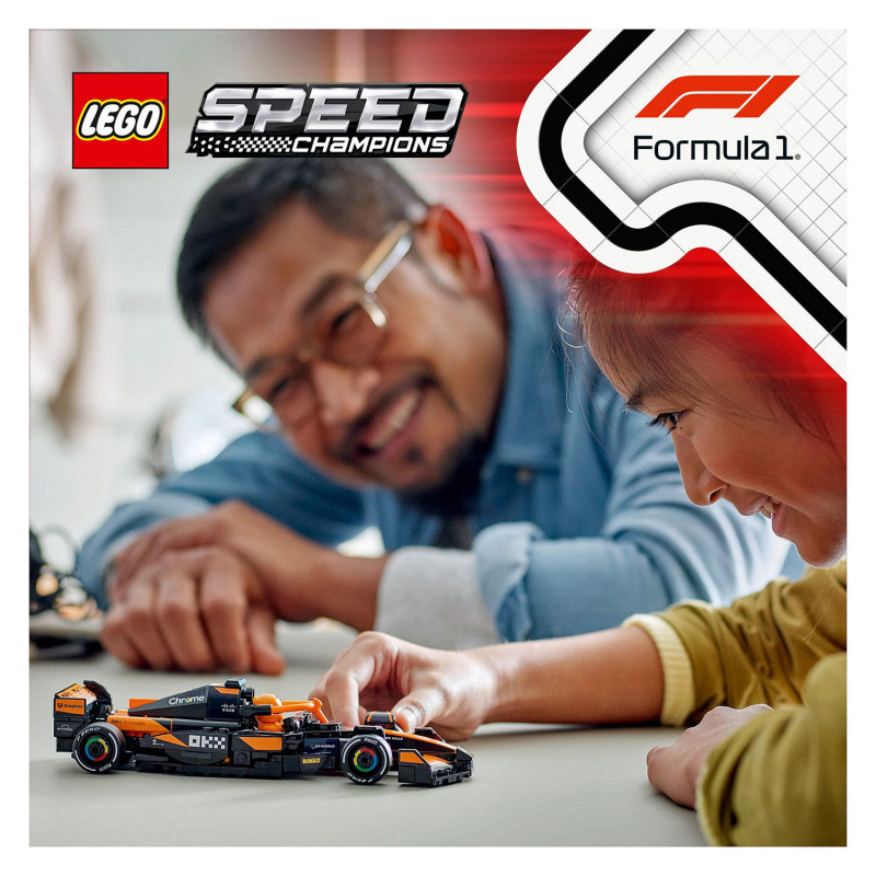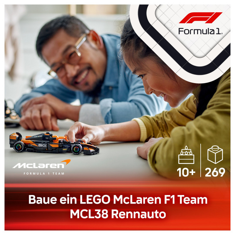 "LEGO Speed Champions McLaren F1® Team MCL38 Race Car. Product type: Building set, Recommended age (min): 10 yr(s), Material: Plastic, Number of pieces: 269 pc(s). Package weight: 294 g"\n"Experience all the excitement of Formula 1® racing with this LEGO® Speed Champions McLaren F1® Team MCL38 Race Car (77251) vehicle set for boys and girls aged 10 and over. Kids and adult car collectors can build, display and race an F1 race car model featuring design details from the real-life version that competed in the 2024 Formula 1 season.