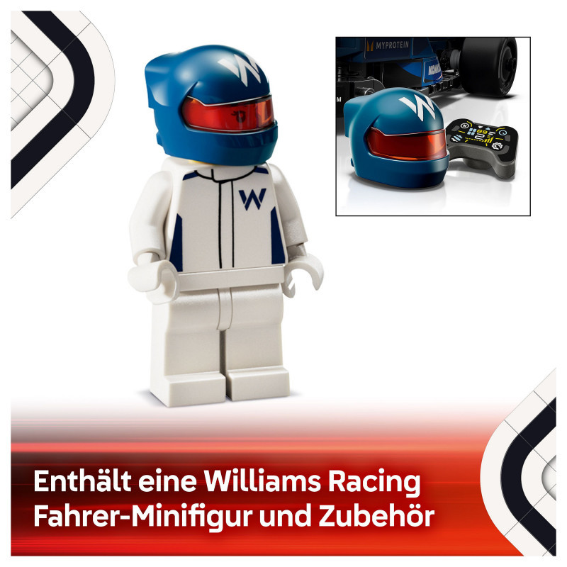 The F1 model car features a cockpit that opens by lifting the halo bar, a rear wing, wishbone suspension, sponsor stickers and wider rear tyres imprinted with “Pirelli”. The buildable F1 toy car also comes with a driver minifigure wearing a Williams Racing outfit and a winged helmet to place inside the cockpit.