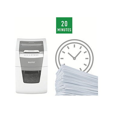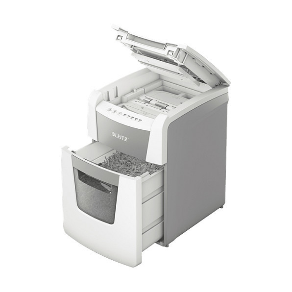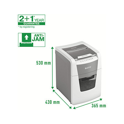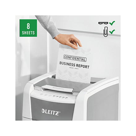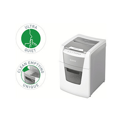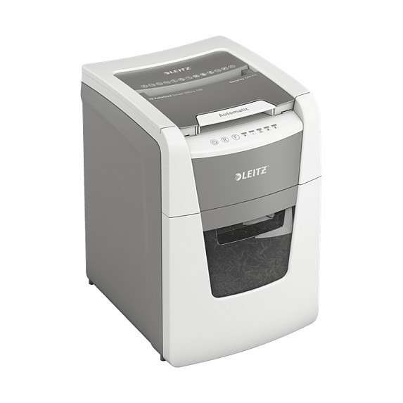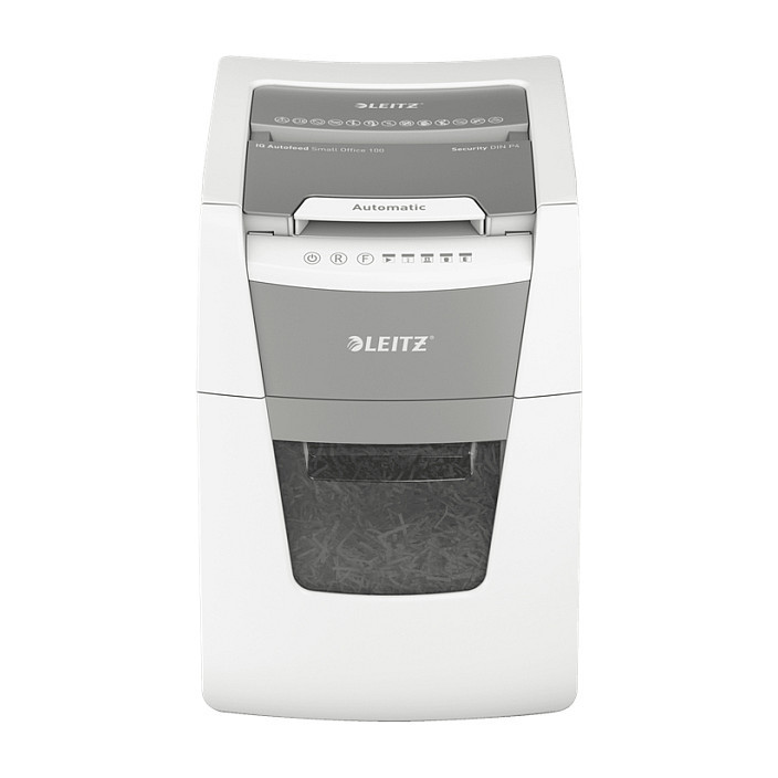 "Leitz IQ Autofeed Small Office 100 Automatic Paper Shredder P4. Shredding type: Cross shredding, Working width: 22 cm, Shredding size: 4 x 30 mm. Power consumption (typical): 300 W. Width: 365 mm, Depth: 430 mm, Height: 530 mm. Warranty period: 2 year(s)"\n"Fully automatic paper shredder from Leitz with unique clean emptying feature. So intelligent it quietly works on its own, just insert your stack of papers (incl. staples & paper clips), close the lid and get on with your day. Ideal for small office use. Confidential security and excellent performance with this anti jam, quiet and long running (20 min) autofeed shredder. Automatically shred 100 sheets of A4 into security P4 (4x30mm) cross cut pieces in one go into the generous 34L bin. Simple operation using touch controls."