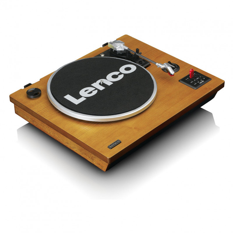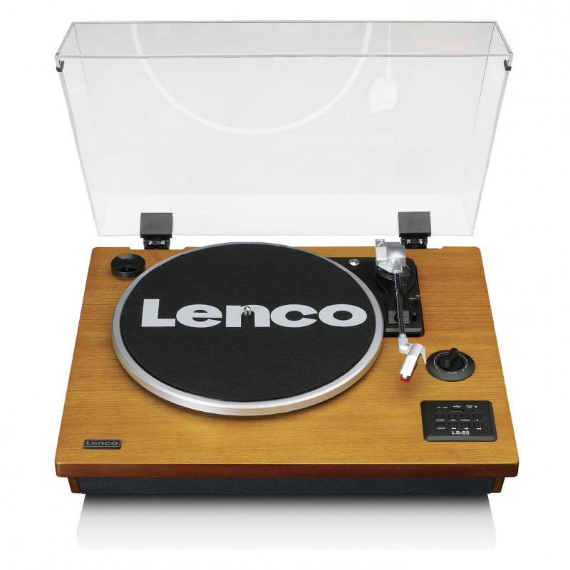 "Lenco LS-55WA. Type: Belt-drive audio turntable, Operation: Semi Automatic, Product colour: Wood. Shape: J-shaped tonearm. USB connector type: USB Type-A, Bluetooth range: 10 m. RMS rated power: 10 W, Speaker type: 2-way. Power supply type: AC, AC adapter input voltage: 100-240 V, AC adapter frequency: 50-60 Hz"\n"The LS-55 is a beautiful wooden turntable with built-in stereo speakers.