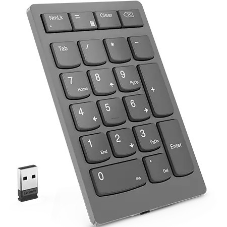 "Lenovo 4Y41C33791. Device interface: RF Wireless, Keyboard number of keys: 21, Purpose: Universal. Product colour: Grey. Weight: 109 g"\n"Go beyond the limitations of your notebook and complement your workflow with a tactile, responsive 21-key keypad that sports premium scissor-switch keys and is compact enough to take on the go. With an impressive up to 3 months of battery life and a powerful 2.4 GHz wireless connector, you can rest easy knowing that your numeric keypad will be ready for action whenever you are."