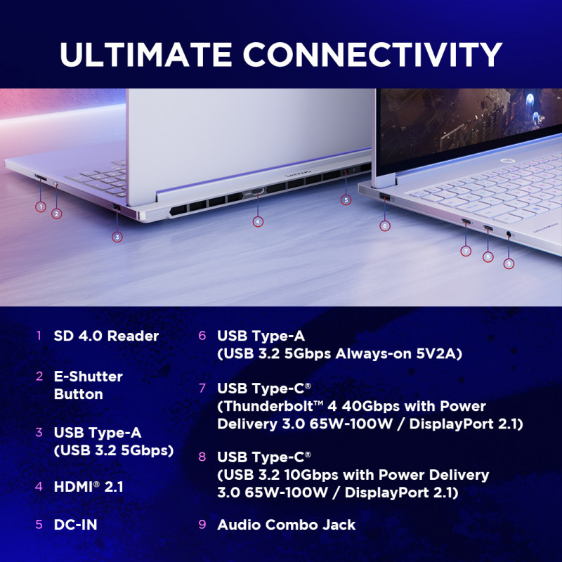 1x USB-A (USB 5Gbps / USB 3.2 Gen 1) 1x USB-A (USB 5Gbps / USB 3.2 Gen 1), Always On 1x USB-C® (USB 10Gbps / USB 3.2 Gen 2), with USB PD 65-100W and DisplayPort™ 2.1 1x USB-C® (Thunderbolt™ 4 / USB4® 40Gbps), with USB PD 65-100W and DisplayPort™ 2.1 1x HDMI® 2.1, up to 8K/60Hz 1x Headphone / microphone combo jack (3.5mm) 1x Card reader 1x Power connector |