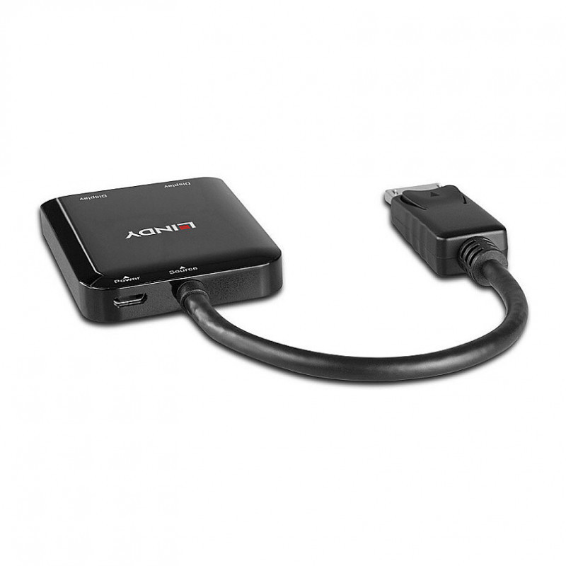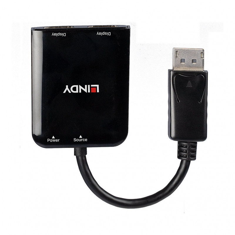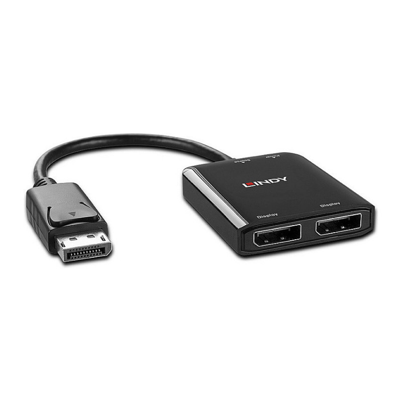 "Lindy 38430. Host interface: DisplayPort, Hub interfaces: DisplayPort. Data transfer rate: 21600 Mbit/s, Maximum resolution (HDMI): 3840 x 2160 pixels, Product colour: Black. Power supply type: USB, Output voltage: 5 V, Output current: 0.5 A. Width: 254 mm, Depth: 10 mm, Height: 49 mm. Quantity per pack: 1 pc(s)"\n"The Lindy 2 Port DP MST Hub is an ideal solution for expanding or duplicating DisplayPort signals across 2 DisplayPort monitors. MST hubs allow for the connection of a single DP source device including computers, laptops or notebooks to 2 separate DP displays, while also providing the ability to visualise content in multiple ways. Signals can be expanded across both displays to show large scale spreadsheets, create immersive panoramic gaming experiences or eye-catching digital signage in retail. Content can also be, independently shown on either display, great for developing a productive, multi-tasking working environment, or duplicated on both displays for use in hospitality, retail or educational scenarios.