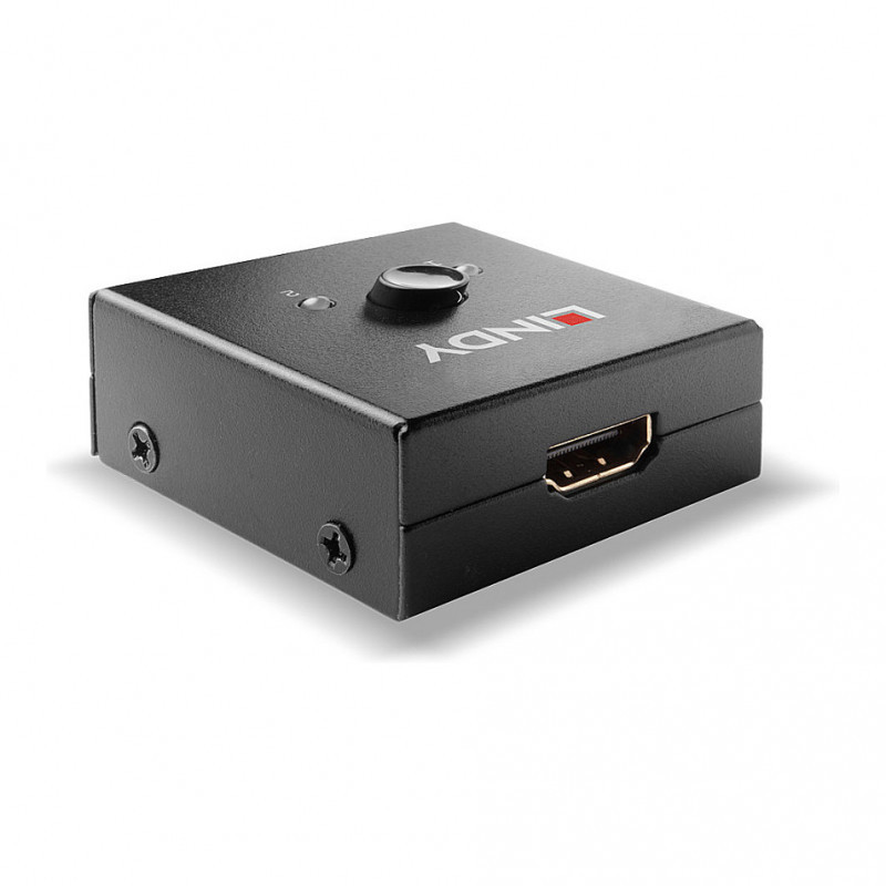 "Lindy 2 Port HDMI 18G Bi-Directional Switch. Video port type: HDMI. Material: Metal, Product colour: Black, Maximum refresh rate: 60 Hz. Certification: CE, FCC, REACH, California Proposition 65. Width: 49 mm, Depth: 52 mm, Height: 20 mm. Package width: 63.5 mm, Package depth: 80 mm, Package height: 28 mm"\n"The Lindy HDMI 18G Bi-directional Switch allows the user to connect two 4K Ultra High Definition source devices such as Blu-Ray players or games consoles to a single 4K Ultra HD display or projector and easily switch between them at the push of a button. Alternatively, connect one 4K Ultra HD source can be connected to two 4K Ultra HD displays or projectors and switch between displays at the touch of a button.