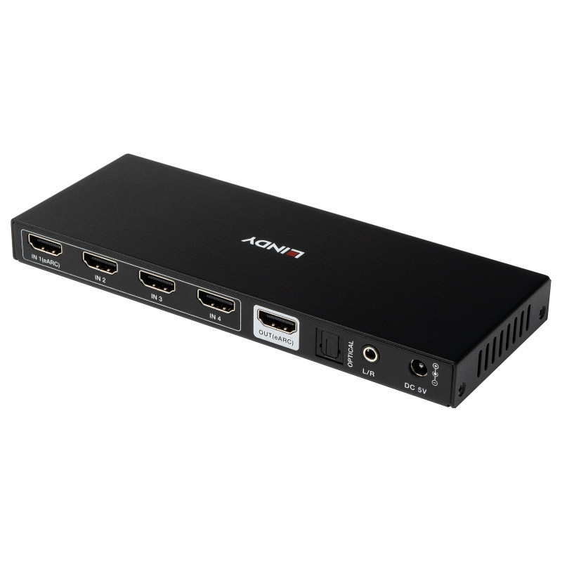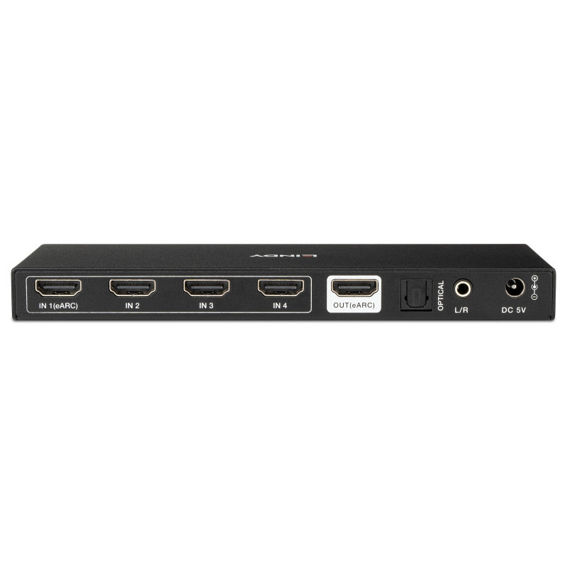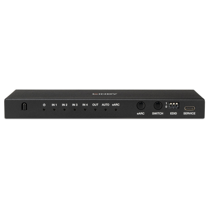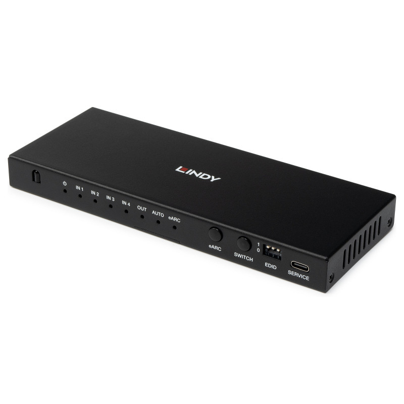 "Lindy 4 Port HDMI 8K60 Switch with eARC. Video port type: HDMI, Console ports: HDMI, USB A, USB C. HD type: 8K Ultra HD, Maximum resolution: 7680 x 4320 pixels, Video bandwidth: 60 Hz. Product colour: Black, Housing material: Metal, LED indicators: Status. Power source: DC, Input voltage: 5 V, Output current: 1 A. Compliance certificates: CE, Federal Communications Commission (FCC), REACH, RoHS"\n"The Lindy 4 Port HDMI® 8K Switch with eARC is a professional solution for providing simple yet reliable switching control over 4 HDMI® source devices connected to a single HDMI® display, while also expanding a displays HDMI® port connections. Supporting HDMI® 2.1 48G signals, this switch allows for the transmission of detailed 8K resolutions, while additional support for High-Dynamic Range ensures video content can be seen with enhanced brightness, greater contrasts and a much wider colour gamut, perfect for a premium home cinema experience, eye-catching digital signage in retail settings or engaging presentations. HDCP 2.3 support ensures there are no issues with a variety of 8K content when connected to source devices including set top boxes, Blu-Ray players and 8K HDR media players.